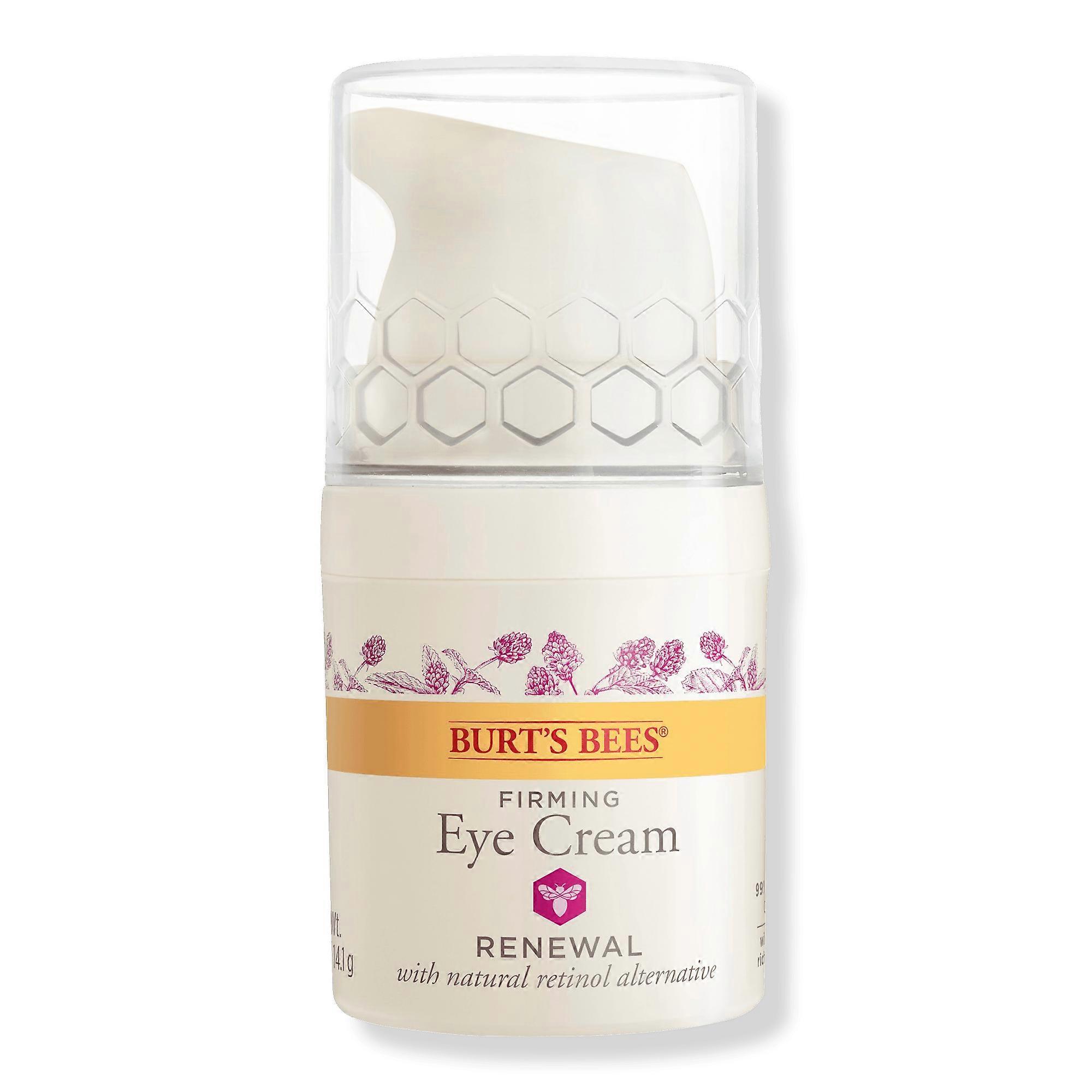 Reduce the look of lines and wrinkles, dark circles, and under-eye puffiness with Burt's Bees Renewal Firming Eye Cream. Benefits Firming Eye Cream: Daily moisturizing eye cream gives intense hydration and reduces the look of lines and wrinkles dark circles and under-eye puffiness for a brightening effect and a renewed glow; package may vary.Natural Retinol Alternative: Bakuchiol a natural alternative to retinol but gentler on skin effectively improves the texture of aging skin evens skin tone and reduces dullness.Anti-Aging Formula: Clinically shown to reduce the appearance of lines and wrinkles, improve firmness, and brighten skin with this anti-aging eye cream with an alternative to retinol.Nourishing Ingredients: Powerful anti-aging fragrance free formula infused with wrinkle smoothing Bakuchiol and naturally hydrating Vitamin E which work in harmony to reveal the best radiant you.Dermatologist Tested: Dermatologist and ophthalmologist tested, this eye treatment is made from 99% natural origin with nutrient rich botanicals and formulated without parabens, phthalates, petrolatum or SLS. Suggested Use: Use in the morning and evening. Place small dots around eye area and gently smooth into your skin. UPC: 000002582698 Weight: 0.53 lbs