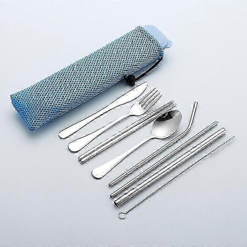 Camping Cutlery, 8-piece Outdoor Travel Cutlery, Hiking Cutlery, Picnic Cutlery Set With Knife, Fork, Spoon, Chopsticks, Metal Straws, Cleaning Brush