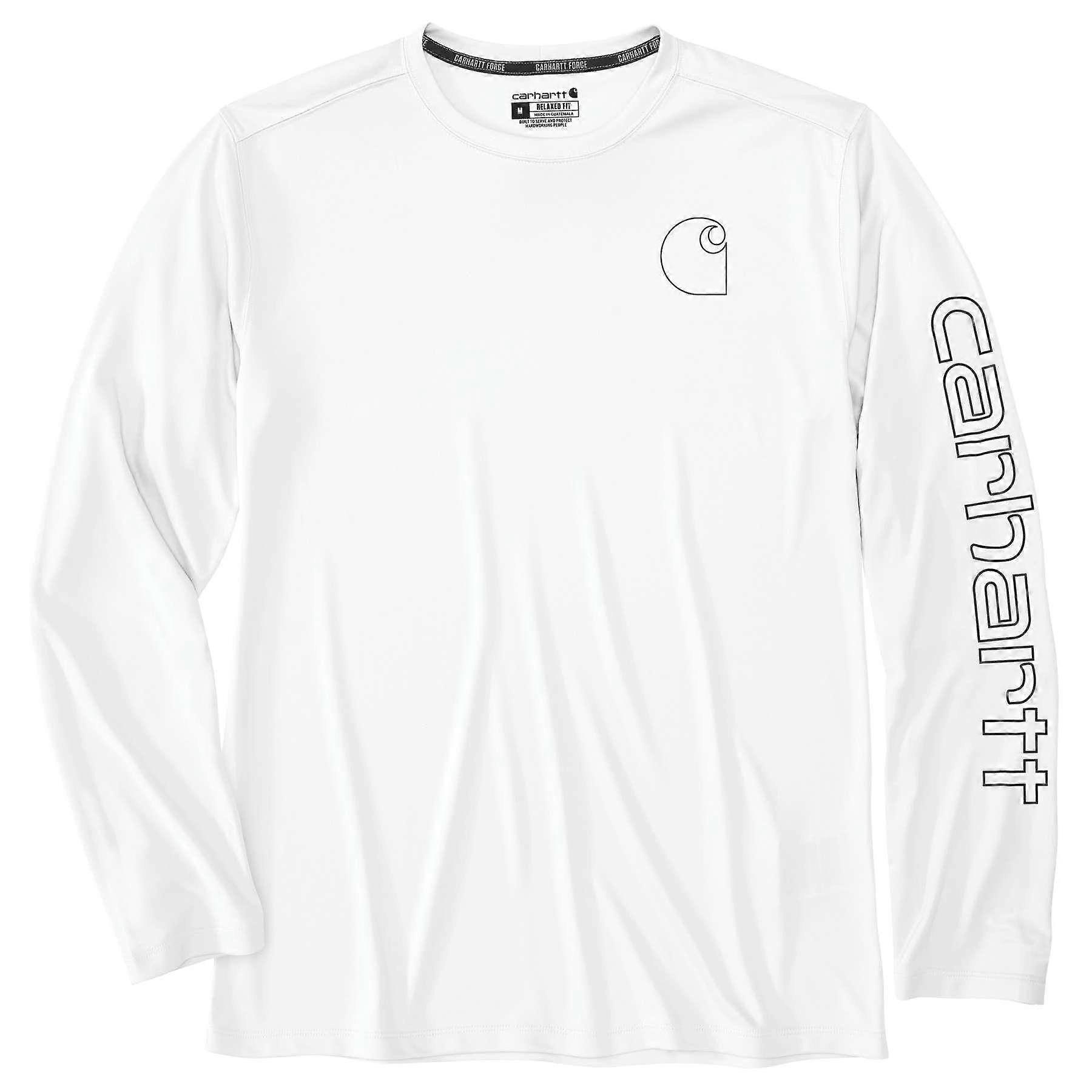 Long-Sleeve Sun Defender T-Shirt With Chest And Sleeve GraphicKey Features and Benefits RELAXED FIT 4 oz/yd² - 136 gsm 100% Polyester Interlock Sun Defender 40+ UPF Fabric Carhartt Force™ - FastDry™ combined with anti-microbial properties FastDry™ - Wicks away moisture for comfort and fights odour with antimicrobial finish Long Sleeve Rib knit crew neck Flat two needle coverstitch hem Carhartt "Logo Graphic" silicon graphic print on front and on left sleeve Carhartt Force™ labelling on left sleeve Carhartt label on front