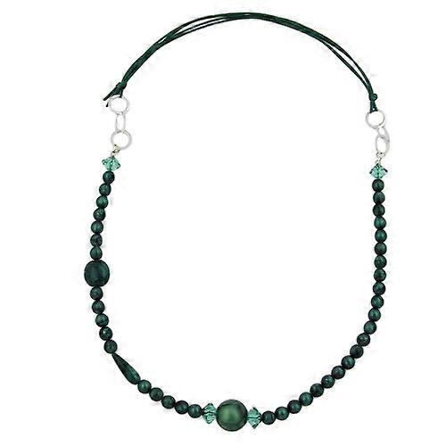 Bei dieser interessanten türkis-grünen Modeschmuck-Kette sind flaschengrüne seidig-glänzende 8mm-Kunststoffperlen auf der einen Seite regelmäßig, auf der anderen Seite unregelmäßig durchbrochen von anderen grünen Perlen gefädelt. Verbunden mit einer doppelten dunkelgrünen 1mm-Baumwollkordel liegt die Kette leicht und angenehm am Hals oder unter einem Kragen. Die Gesamtlänge beträgt 90cm und ist einkürzbar mittels Schiebeknoten auf 75cm. Blickfang sind die drei 14mm großen rhodinierten Metallringe aus einer Messinglegierung, die am Übergang zum textilen Teil der Kette auf jeder Seite funkeln. Lange Ketten ab 60cm eignen sich gut als Pulloverkette und können ohne den Verschluss zu öffnen über den Kopf angelegt werden. Farbiger Schmuck betont die Farben der Kleidung oder setzt zusätzliche Akzente. Länge: 90cm Material: Kunststoff Farbe: smaragd Preis per 1 Stck
