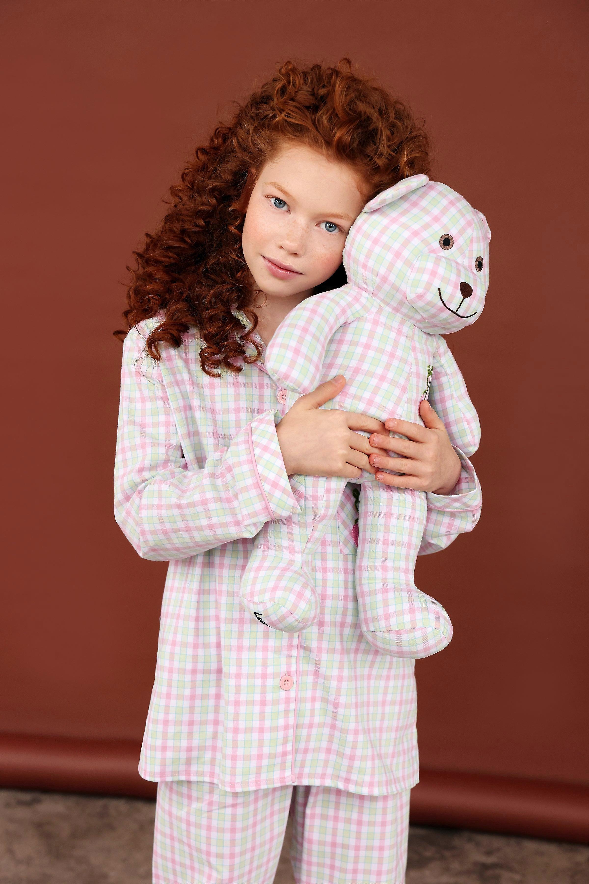 Cheer Girls Pyjama Set With Matching Teddy Bear – 100% Cotton Pink, Green & White Check | Ages 1–15