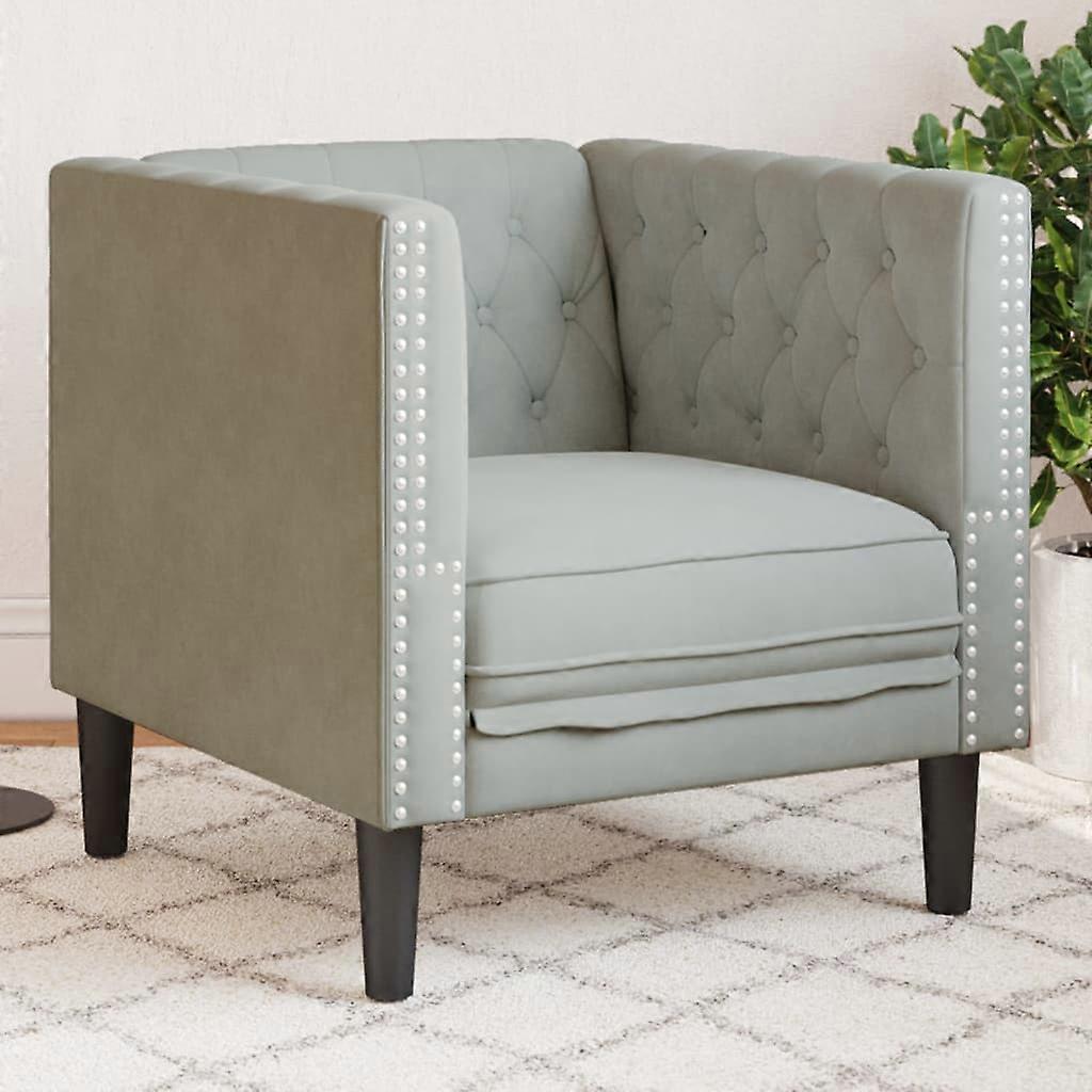 Dieser Chesterfield-Sessel bietet den idealen Platz zum Plaudern, Lesen, Fernsehen oder einfach nur zum Entspannen. Es wird ein echter Blickfang in deinem Zuhause sein. Weiches und komfortables Material: Der Samtstoff hat eine weiche und sanfte Oberfläche, die sich angenehm auf der Haut anfühlt und höchsten Komfort bietet.Bequemes Sitzerlebnis: Der Sessel ist durch die dick gepolsterte Sitzfläche, die Armlehnen und die Rückenlehne sehr bequem.Chesterfield-Stil: Mit der klassischen Rückenlehne und den Armlehnen mit Knopfheftung ? beide auf gleicher Höhe ? wertet der Clubsessel jeden Raum auf und sorgt für Stil und Komfort.Stützbeine: Der Polstersessel wird von stabilen Beinen getragen, die seine Stabilität und Standfestigkeit gewährleisten. Farbe: HellgrauMaterial: Samt (100% Polyester), Sperrholz, MassivholzFüllung: SchaumstoffGesamtabmessungen: 71 x 74,5 x 70,5 cm (B x T x H)Sitzbreite: 55 cmSitztiefe: 59,5 cmSitzhöhe vom Boden: 41,5 cmArmlehnenhöhe vom Boden: 70,5 cmMax. Belastbarkeit: 110 kgZusammenbau erforderlich: Ja