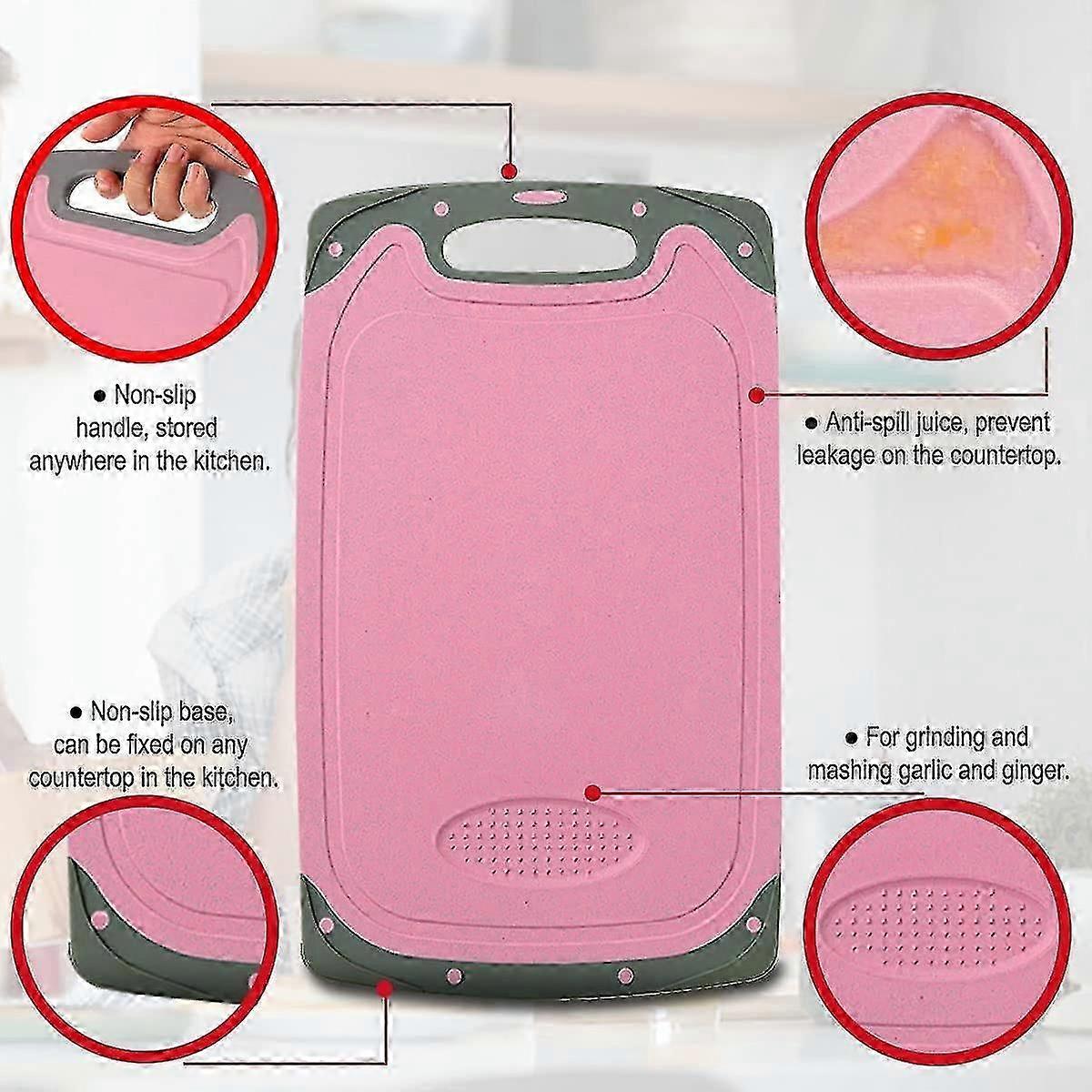 SAFETY DURABILITY CHOPPING BOARD: Large double cutting surface chopping board set is made of BPA-free PP material, which is strong, durable and antibacterial. Double-sided reversible design doubles the usage amount and is not easy to deform and break. The cutting board provides a solid and durable cutting surface that wont dull or harm knives while also keeping counter-tops protected. You don't worry about foods residue or leaving a knife mark, making food preparation more secure and easy.ELEGANT COLOR CODE: PINK represents all kinds of meat food, GREEN represents all kinds of fruit food, BLUE represents various vegetable foods. Different colour plates are suitable for cutting different foods, and classification is very clear, so as to avoid the spread of bacteria, it is clean and hygienic. Besides, colorful cutting boards with different icons help you make faster choices, which is a perfect collocation to any kitchen.ALL-IN-ONE GRIND CHOPPING BOARD: We have added the grind place of three bigger plastic chopping boards. So you can grind out the garlic or ginger or mustard on this cutting board. Flexible, lightweight chopping boards set are perfect for your kitchen cutting needs. Besides, chopping boards juice groove along the border can help catch the juices from meat, fruit, or vegetable when cutting on the boards so that they wont spill on your kitchen countertop.ANTI-SLIP DESIGN & EASY TO CLEAN: Cutting boards anti-slip dots on the four corners and non-slip structure on the back, increasing friction between the chopping board and the cooking table. The two sides of the cutting board have strong adsorption force which prevents the chopping board from slipping during use. In addition, Its non-porous design makes it stain-resistant and easy to clean. After using, they can be safely washed in the dishwasher or rinsed with water.WIDE RANGE OF USE: Ergonomically wide handle design, which is convenient for hanging drain and storage, and does not occupy the kitchen space. They are suitable for all types of food including meat, fish, fruit, vegetables, bread and cheese, etc. Coloured cutting boards set can be used as Chopping board, Serving Tray, Charcuterie Board, Bread Board, Large Chopping Board, Large Cheese Board etc. It will be the best kitchen helper for your daily kitchen utensils.YOUR IDEAL GIFT OPTION: These 3 cutting boards greatly satisfy your cutting needs whether for cutting vegetables, carving meat, or prepping a garnish. Premium quality product, practical design, and lifetime service make these chopping board set a perfect gift for mom, friends, and neighbors. Great idea for Housewarming, Birthday, Graduation and more gifts.
