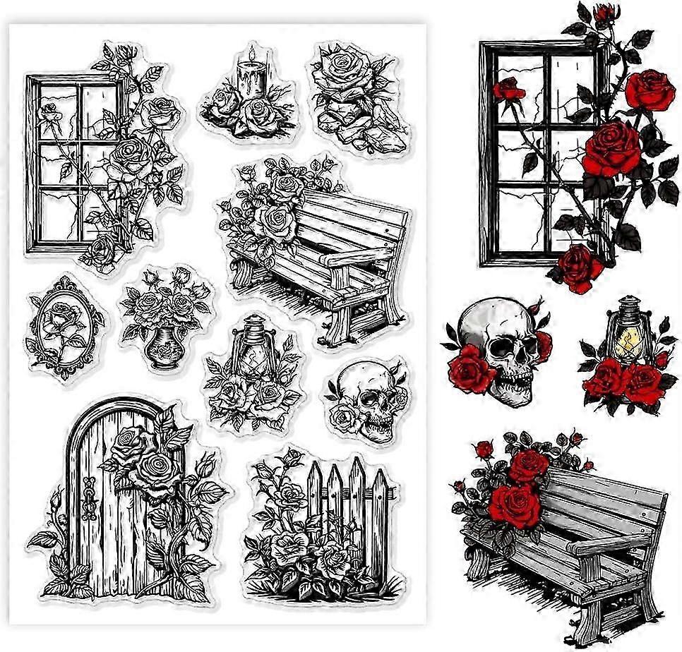 Christmas Clear Stamp, Romantic Floral Silicone Stamp Window Skull Mirror Bench Fence Transparent Rubber Stamp for Card Making, Photo Albums, Holiday