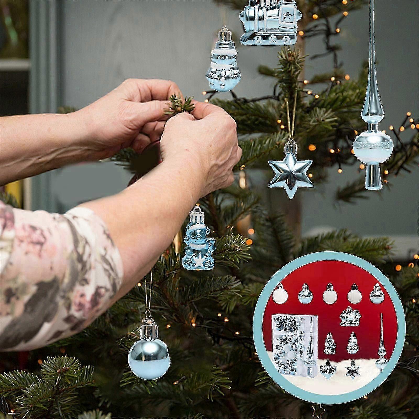 Christmas Pendant Decorative Shatterproof Christmas Tree Pendants Hanging Christmas Baubles Ornaments Set Pack Of 34 PcsFeatures:Abundant styles and colors: This set includes 34 exquisite Christmas pendant decorations, with various styles ranging from classic red and green to shiny gold, blue, and warm white. The colors are abundant and can meet the needs of different styles of Christmas tree decoration, adding a festive feel to your home. Good quality shatterproof material: All pendants are made of good quality shatterproof material, which not just retains the glass like texture, but also avoids the danger of fragility, ensuring that they can remain beautiful even after long term use, suitable for families with children or pet. Convenient hanging design: Each pendant is equipped with easy to hang accessories such as metal rings or hooks, allowing you to easily hang it on the Christmas tree without worrying about falling or damage. At the same time, the set also includes decorations on the top of the Christmas tree. Meanwhile, a reasonable size design makes the suspension more flexible and suitable for Christmas trees of different sizes. Enhance the festive feel: These pendants not just serve a decorative purpose, but also create a festive feel. Whether it's heart shaped or star shaped pendants or decorations on the top of Christmas trees, they can instantly enhance the Christmas feel of the home, allowing family and guests to feel a strong festive feel during the holiday season. Cost effective choice: A set containing 34 pendants, which is more cost-effective than purchasing them separately. Moreover, due to the use of good quality but cost-effective materials, this set of jewelry not just maintains its beauty and durability, but also has a high cost-effectiveness, making it one of the good choices for holiday decoration. Product Description:Material:Plastic.Color:blue.Suitable age:1+.Product size:20.5x15x5cm(8.07x5.91x1.97in)Packing size:20.5x15x5cm(8.07x5.91x1.97in).Weight of individual product package:300g/0.66lb.Package Contents:1x Christmas Baubles Ornaments Set Pack Of 34 Pcs