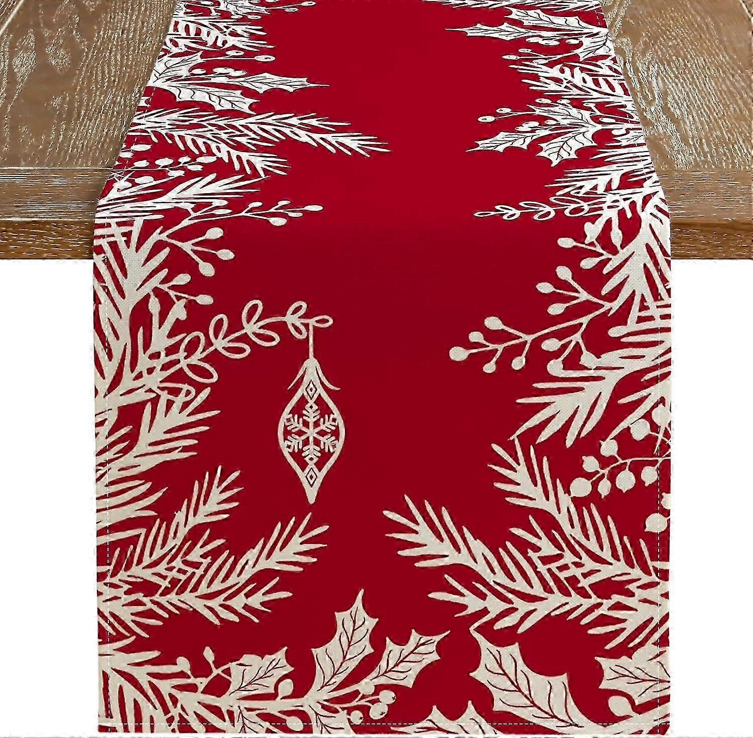 Christmas Leaves and Red Flowers Table Runner 13x90 Inch, Winter Holiday Indoor Outdoor Table Decorations for Home