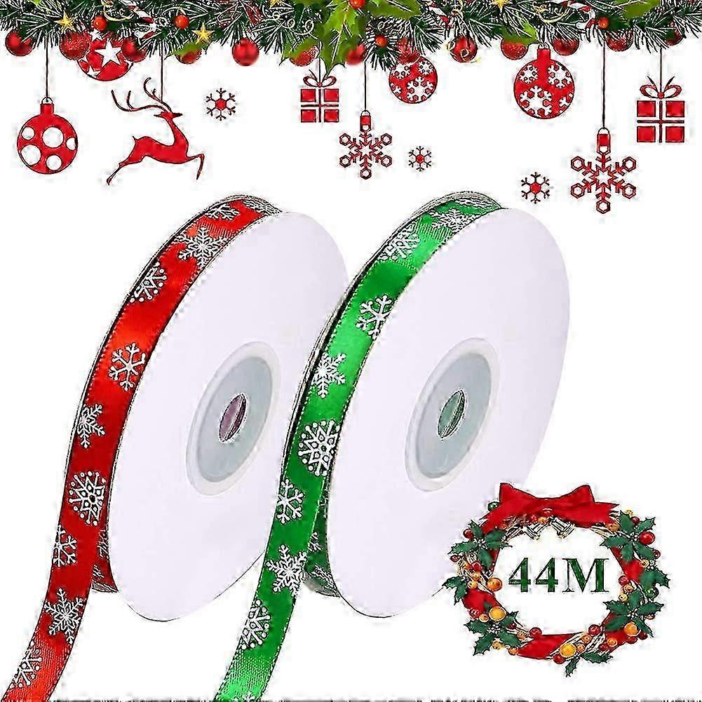 Christmas Ribbon, 2 Rolls Green And Red Satin Ribbon For Christmas Gift Wrapping, 10mm Snowflake Grosgrain Ribbon, Total 44m/50 Yards, Christmas Ribbo