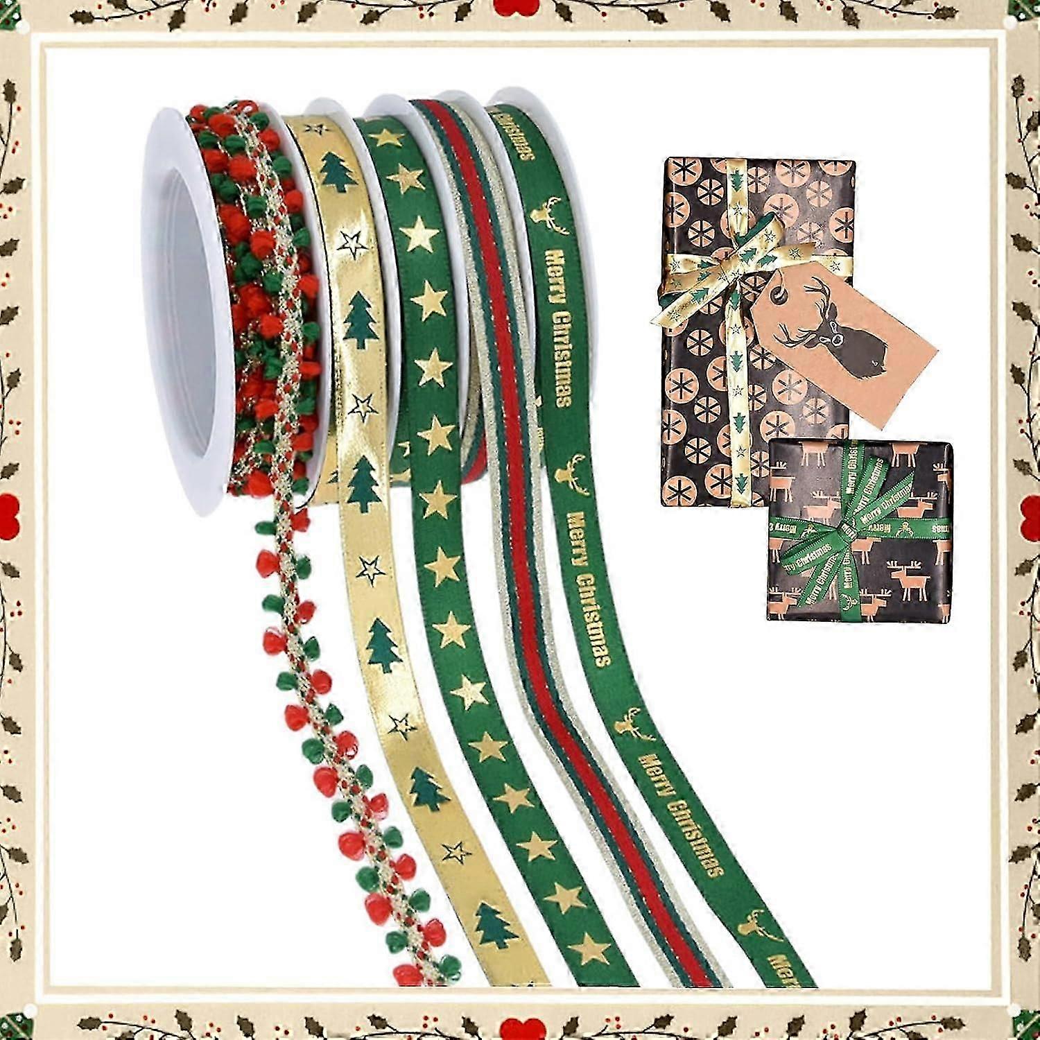 Christmas Ribbon 5 Roll Xmas Ribbons Christmas Grosgrain Ribbons Bundle Christmas Wrapping Ribbon Wide Double Faced Polyester Satin Ribbon Winter Holi