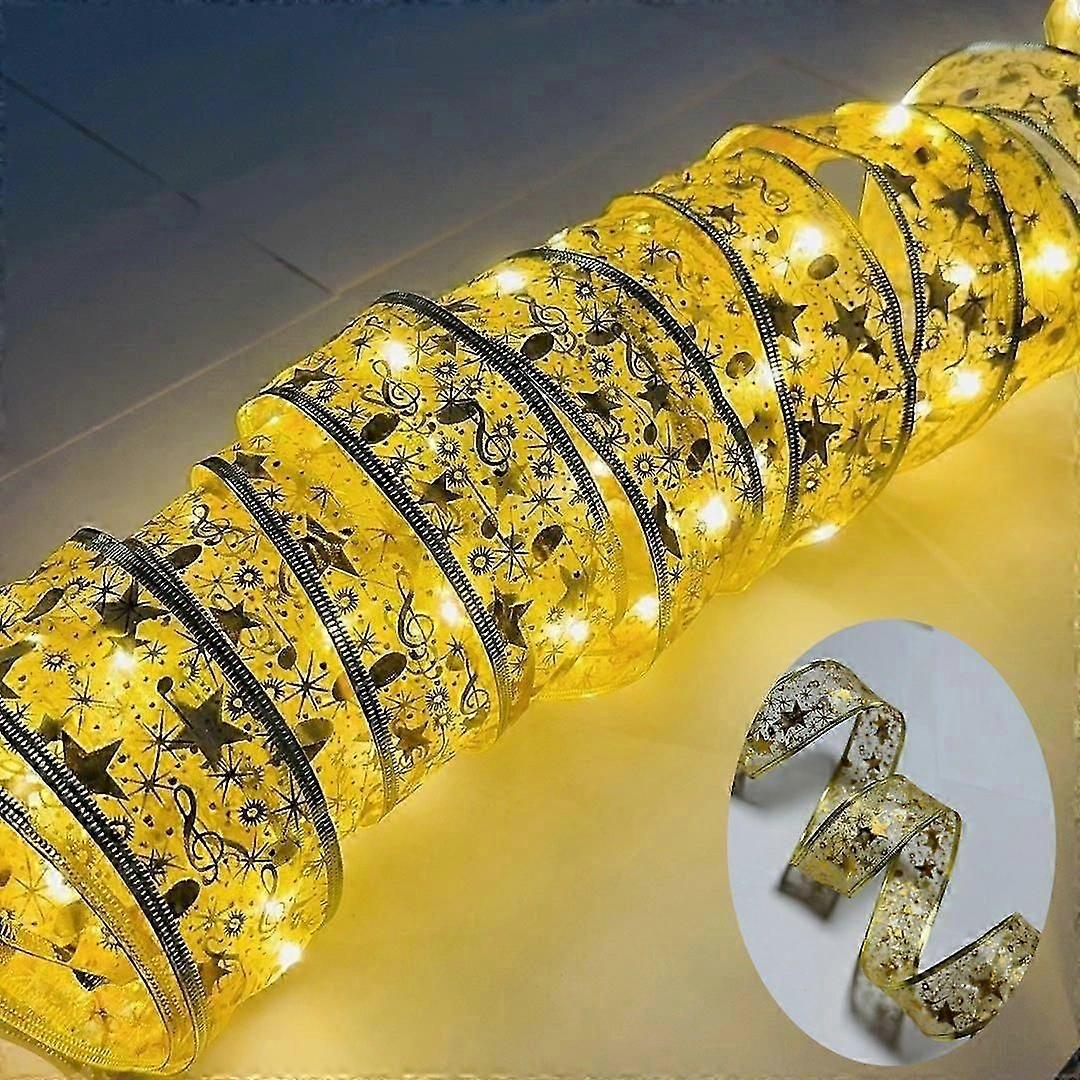 About this item UNIQUE DESIGN: Double layers of organza sheer ribbon lights with gold glitter Xmas pattern and gold edge are especially suitable for decorating Christmas trees.EASY TO SHAPE: The Christmas copper wire in the ribbon lights is made from high-quality copper wire and is bendable. You can DIY it into any shape you like, such as a bow, and will hold its shape for various purposes of decoration; ideal beautiful ornament for all scenes, occasions, and festival celebrations.