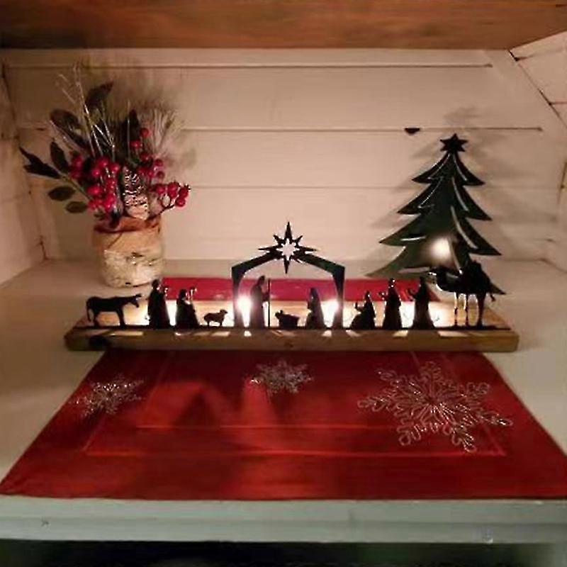 Thoughtful Gift: This nativity scene Christmas decoration is a thoughtful and meaningful gift for your loved ones. Whether it's for a friend, family member, or coworker, this timeless decoration is sure to be cherished, spreading a message of hope and love during the holiday season.Easy to Install: Installing this nativity scene set is effortless. Simply place the scene on the wooden base and bring the nativity scene to life in your home. Its compact size ensures that it fits seamlessly into any space, allowing you to create a festive atmosphere without overwhelming your decor.Perfect Table Centerpiece: Adorn your tabletop, mantel, or shelf. Its elegant design makes it an ideal centerpiece for your Christmas table, creating a warm and inviting atmosphere for your family and guests.Meaningful Symbolism: The nativity scene has deep meaning, symbolizing the birth of Jesus and the spirit of love, peace, and joy. Displaying this Christmas set in your home can serve as a reminder of the true meaning of Christmas, evoking awe and gratitude during the holiday season.Durable Material: The Christmas figurines are made of high-quality black metal with beautiful details and are durable, ensuring that your Christmas table decorations retain their charm for years to come.