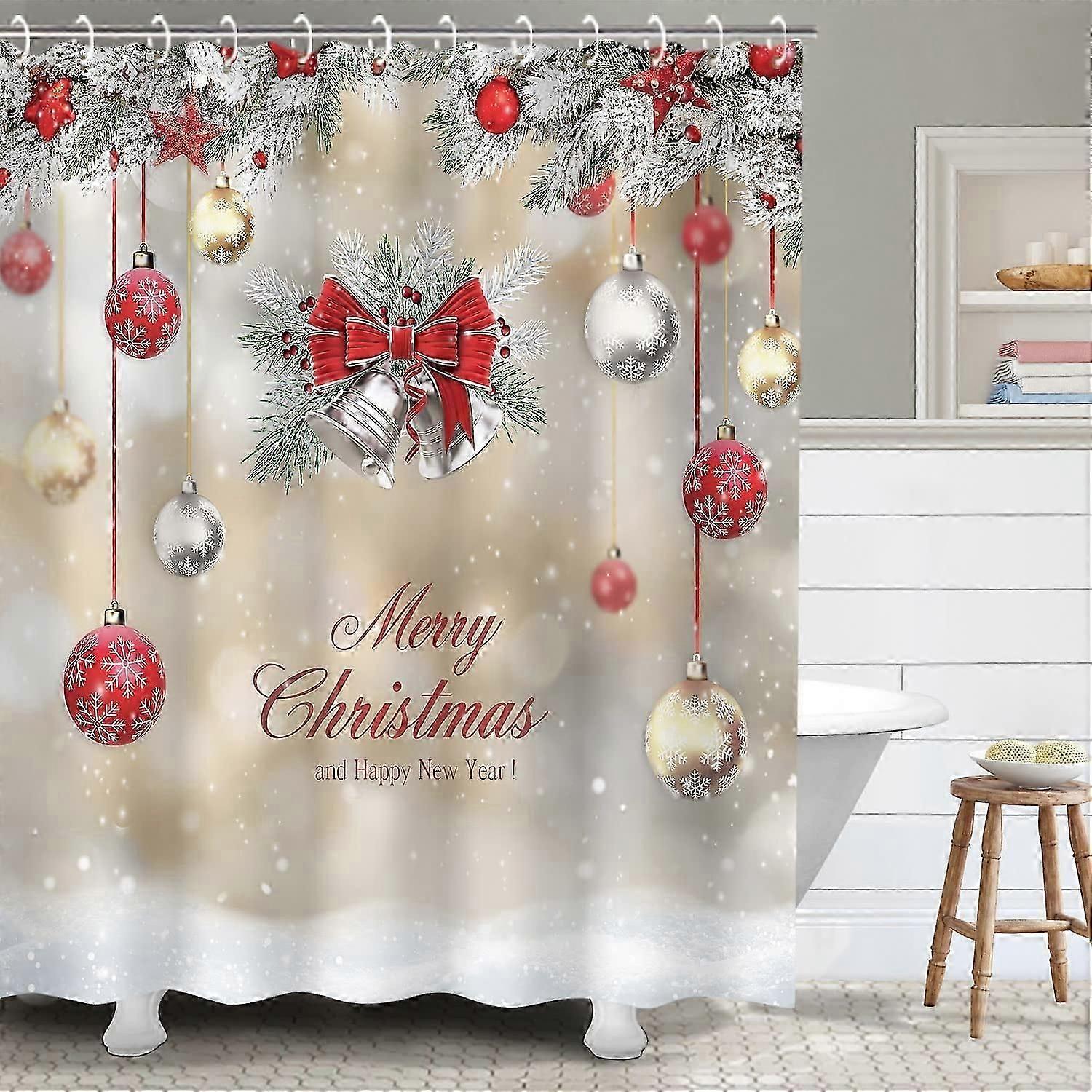 Christmas Shower Curtain 72"x72" with Hooks, Red Xmas Bathroom Decor, Compatible with Holiday Bath Sets, Merry Christmas Baubles Design