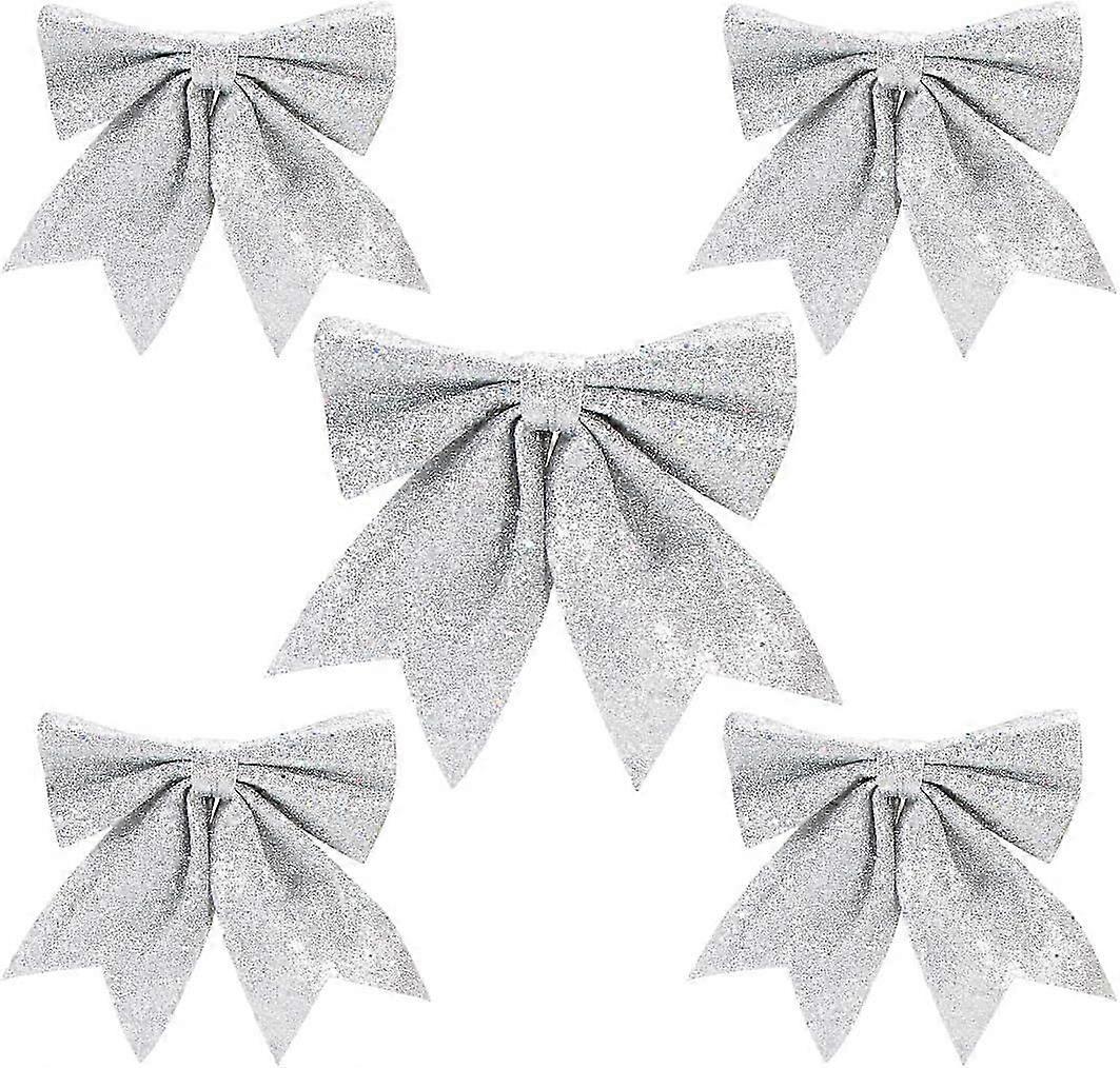 Christmas Silver Bows Pack of 5 Christmas Tree Bows Silver, Christmas Bows Large, Christmas Glitter Bows, Gift Christmas Decoration Bows 24 and 18 cm