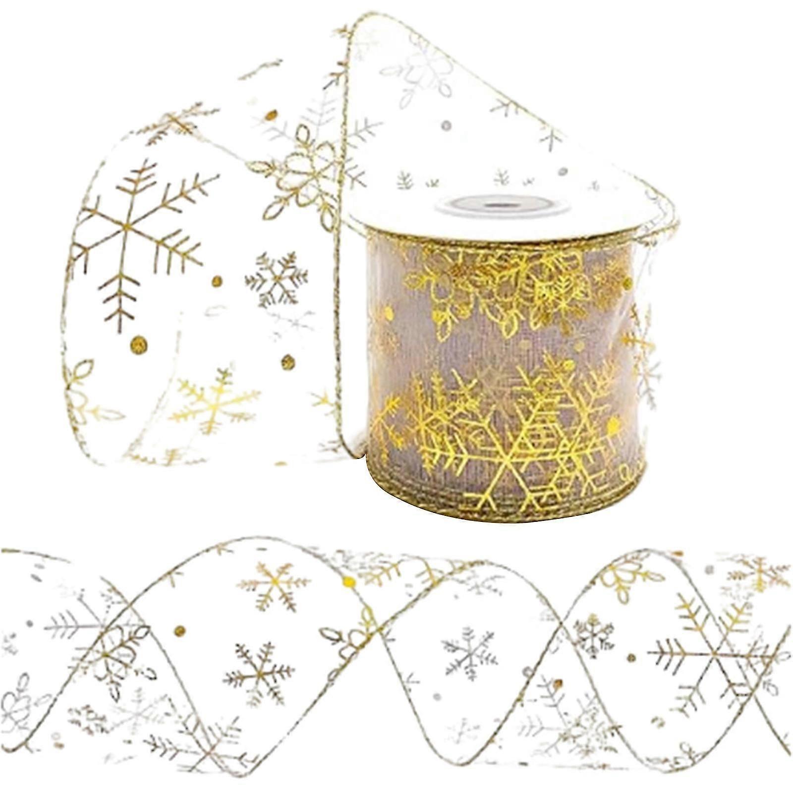 Christmas Snowflake Ribbon, Gold Snowflake Wired Ribbon For Christmas Tree, Gift Wrapping, DIY Crafts And Home Decoration