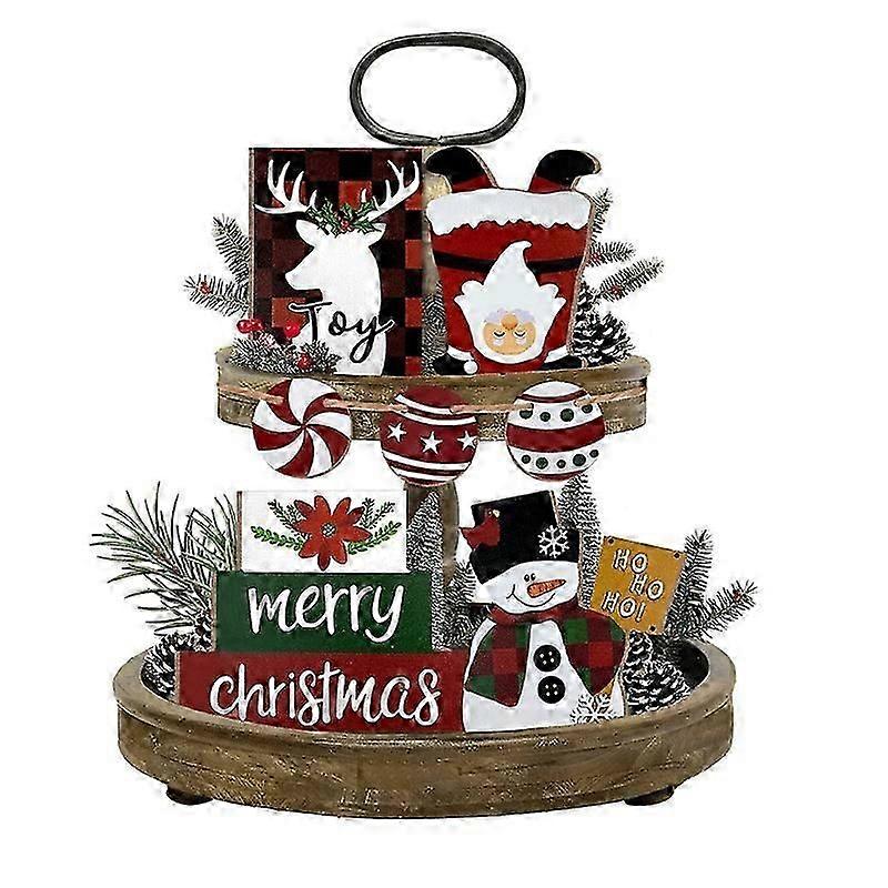 Christmas Tiered Tray Decor 7 pieces Christmas tiered tray decorations set is a perfect addition to your home decoration, which will bring a strong Christmas atmosphere to your home. You will get 1 cute snowman sign, 1 funny upside down Santa sign, 1 red buffalo plaid reindeer sign, 1 "merry christmas" sign and 3 colorful candy pendants. With the snowman tiered tray decor, you can spend a wonderful Christmas with your family. Please notice that tiered tray is not includedPremium Wood Material The tiered tray decor is made of premium wood material, which is durable, smooth and not easy to break. With high quality color painting, the patterns and words of the Christmas tray decor signs are clear and you dont need to worry about fading. Sturdy and beautiful, these wooden signs will be a perfect choice for your Christmas home decorXmas Farmhouse Themed Design Designed with snowman, Santa, reindeer, candy and other classic Christmas elements, the Christmas tier tray decor will be a highlight of your Christmas party. These farmhouse Christmas tray decor will create a warm and fun Christmas carnival atmosphere for your home and party, bring you a sense of happiness. Everyone who has seen it will love this Santa tiered tray decorations setWide ApplicationThe farmhouse tray decorations set is a perfect home decor. You can create your own Christmas table centerpieces. You can also use these tiered tray wooden signs to decorate the coffee bar table, fireplace, cabinets, shelves, kitchen, counter, dining table, living room, window sills or anywhere you want to display them in Christmas farmhouse style. A great Christmas decor to cheer up your homePerfect Christmas GiftThe tiered tray christmas decor set is a perfect gift. With lovely shapes and vivid colors, this Christmas tiered tray decor will definitely attract and surprise your guests. You can serve these Christmas tray decorations as exquisite gifts for your families, friends, relatives, neighbors, colleagues and classmates on Christmas, winter holiday, housewarming party, birthday or just ordinary days