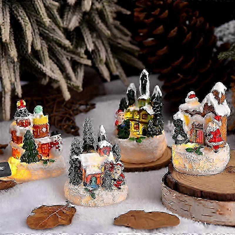 4-Piece Christmas Village House Set: The 4-piece Christmas village house with its exquisite design and rich scenes, adds a strong festive atmosphere to your home and can also bring joy and warmth to the family.High-quality material: Made of high-quality resin, it is safe, environmentally friendly, sturdy and durable, and can be used for a long time, so that you and your family can enjoy the warm holiday season with peace of mind.LED light: Our Christmas village house has built-in LED lights that are operated by 3 button batteries and can be used when you turn on the switch to give you a warm and pleasant light.Battery not includedIdeal Christmas gift: With exquisite craftsmanship and exquisite appearance, this Christmas village decoration set is an ideal gift for friends, family, neighbors, colleagues, etc. You will love it.Multiple occasions: This Christmas village house is not only suitable for winter parties, festivals and weddings, but also adds a unique charm to your home or garden decoration. Whether placed on the fireplace, table or shelf, it gives every room a joyful atmosphere.