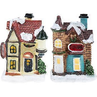 Christmas Village Set of 2 Light up Country Houses Mini Xmas House Holiday Snow Town Landscape Scene Adornments Christmas Party 7.5x5.5cm,7.5x5.5cm