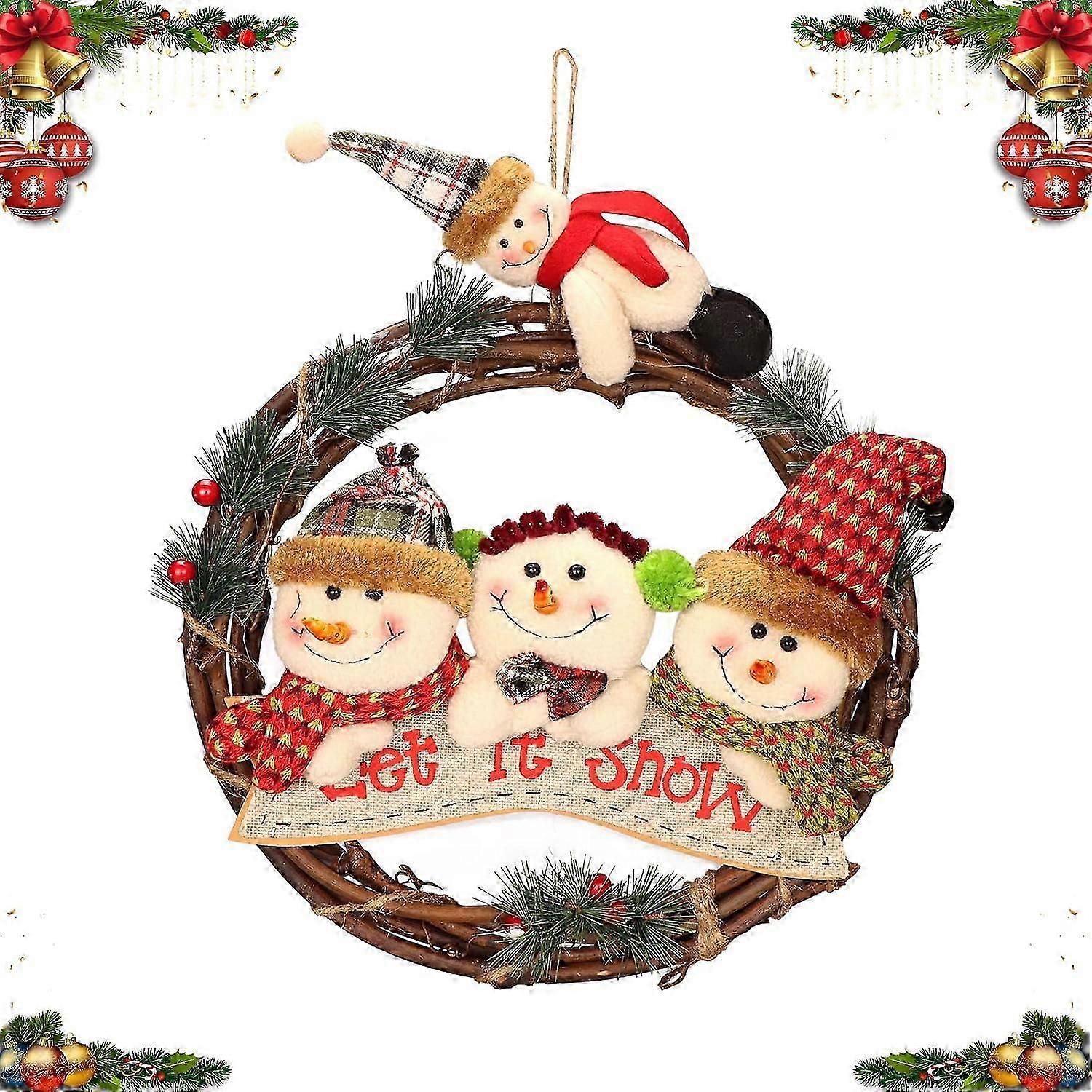 Christmas ElementsThis Christmas wreath door decoration is made of rattan and 3 snowman dolls with a round garland design. Cute and lovely cartoons, this ornament looks beautiful and can be hung anywhere to enhance the Christmas spirit and make the holiday even better. High-quality material The garland decorations of Christmas are made of high-quality fabrics and rattan, lightweight and durable, fine workmanship, safe and non-toxic, not easy to deform and reusable. These decorations can easily survive the holidays year after year. Hanging DesignWith a lanyard on the back, it is easy to hang and decorate, suitable for stores, home or parties, etc., creating a strong Christmas atmosphere. And easy to maintain, just wipe with a clean, dry cloth. No cleaning or maintenance required. Perfect Christmas Ornament This Christmas snowman wreath is perfect size - width 29cm/11.41"; height 29cm/11.41", you can hang it anywhere to add Christmas atmosphere. With the excitement of the holidays approaching Christmas, Christmas decorations are also a must. Decorate the Christmas tree, bed, stairs, fireplace. Particularly suitable for Christmas, New Year and other holiday designs. Wide application Christmas and New Year celebrations, home decoration, offices, hotels, shopping malls, parties, the perfect decorative accessory to add Christmas atmosphere to the Christmas holidays. You can also give it to anyone as a unique gift. At the same time, they are a great gift and surprise for your child.