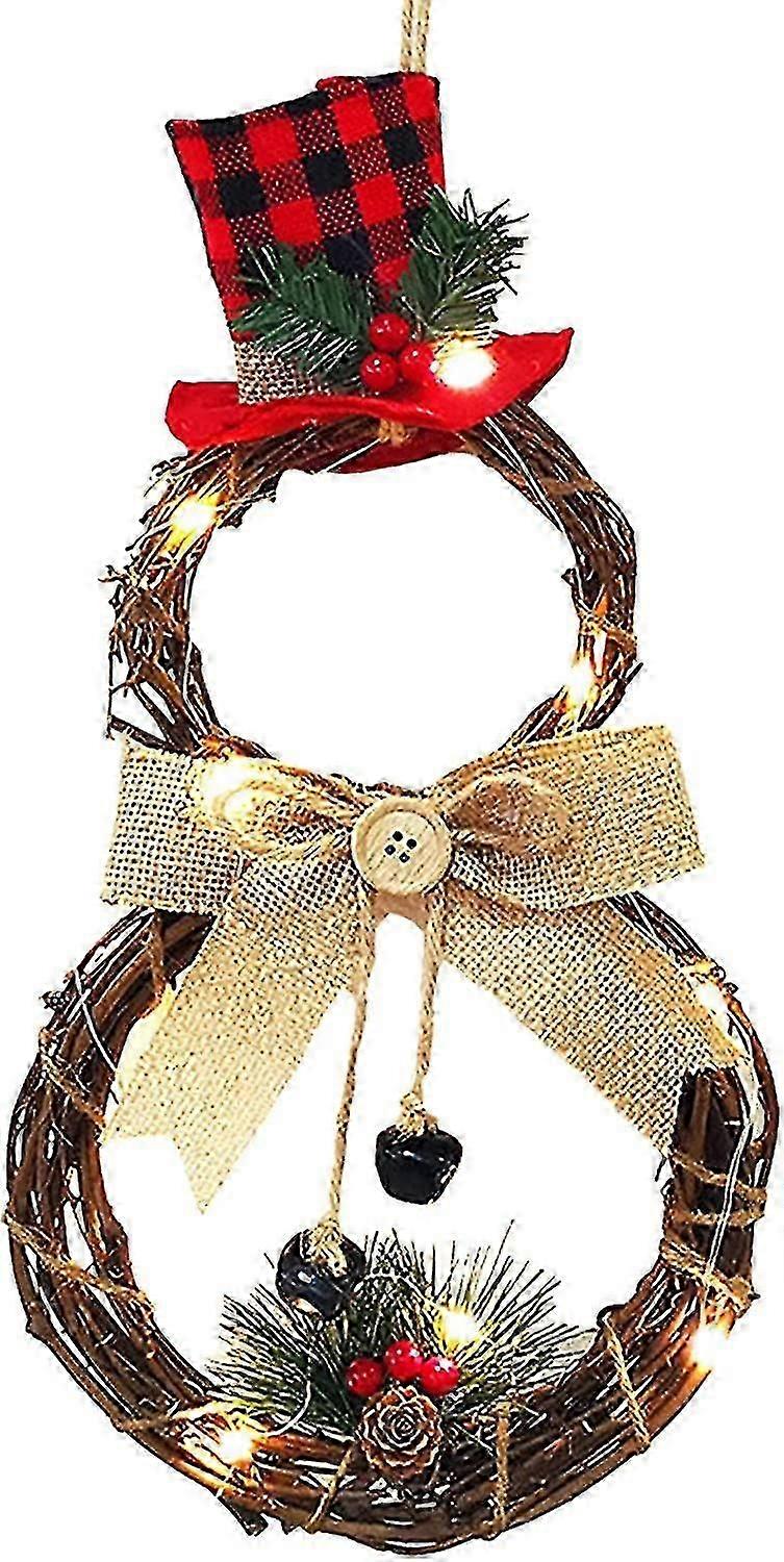 Christmas Wreath Decorations, Grapevine Wreath, Holiday Wreath Bow Knot Snowman Pendant With Led Lights, Front Door Garland Wall Hanging Ornament For