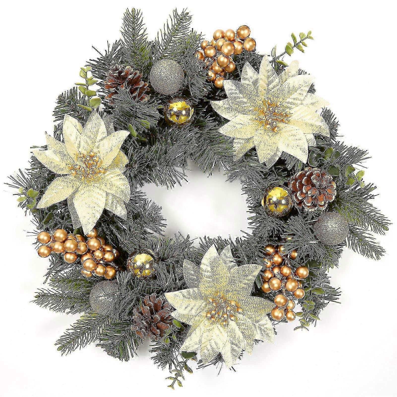Christmas Wreath, Door Wreath With Christmas Baubles, Christmas Flowers, Berries And Pine Cones For Front Door, Fireplace And Wall Decor - Gold 40cm