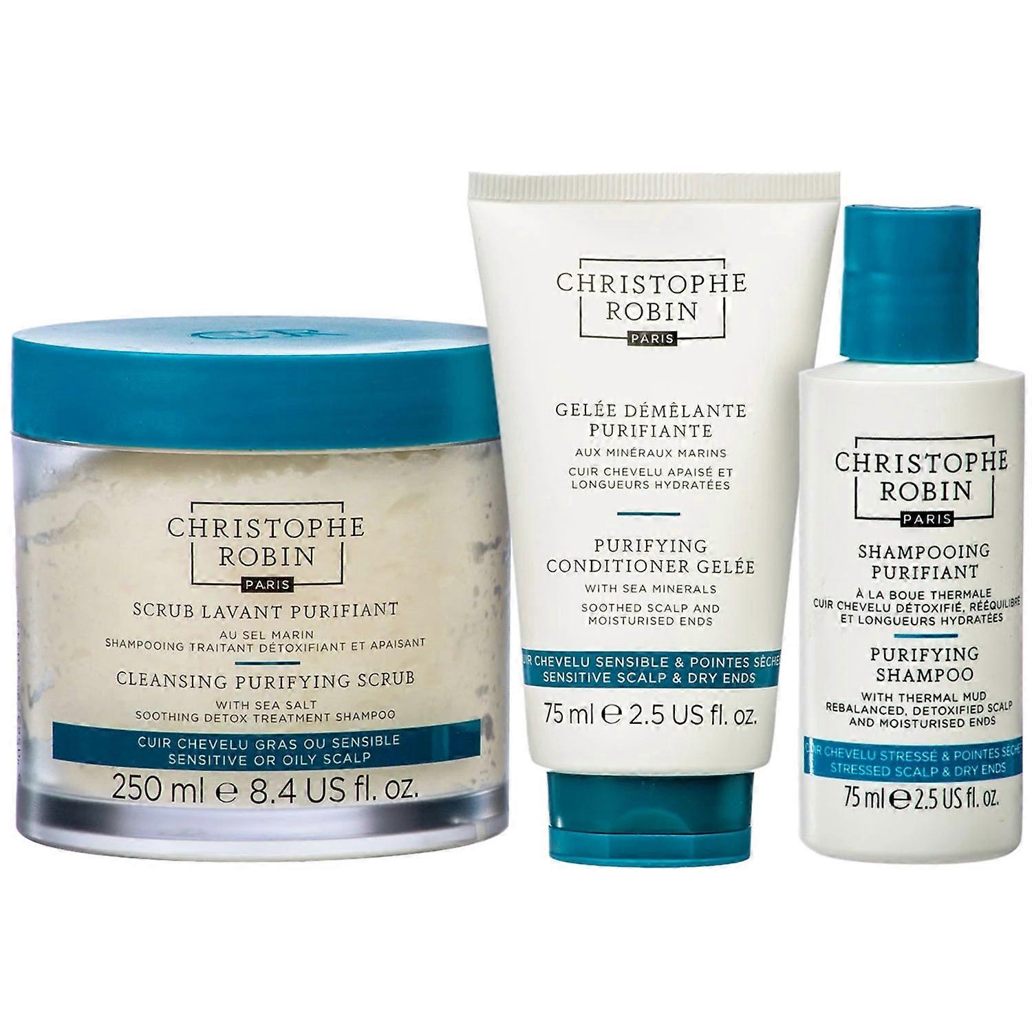 Christophe Robin's Hair Detox Gift Set is a comprehensive 3-piece kit featuring the full purifying routine. This set effectively removes product buildup and excess oils from hair and scalp. It gently cleanses to restore and strengthen every strand, leaving hair refreshed and revitalized. The set includes: Cleansing Purifying Scrub with Sea Salt Purifying Shampoo with Thermal Mud Purifying Conditioner Gelée with Sea Minerals Ingredients Cleansing Purifying Scrub: Sodium Chloride, Sodium Laureth Sulfate, Aqua/Water/Eau, Butylene Glycol, Cocamide Mea, Glyceryl Stearate, Fragrance (Parfum), Hydrated Silica, Peg-100 Stearate, Phenoxyethanol, Saccharide Isomerate, Bisabolol, Menthyl Lactate, Prunus Amygdalus Dulcis (Sweet Almond) Oil, Citric Acid, Sodium Citrate Purifying Shampoo: Aqua/Water/Eau, Cocamidopropyl Betaine, Sodium Lauroyl Sarcosinate, Coco-Glucoside, Polyacrylate Crosspolymer-6, Fragrance (Parfum), Sodium Chloride, Propanediol, Kaolin, Silt, Sodium Benzoate, Maltodextrin, Sea Water Extract, Disodium Edta, Guar Hydroxypropyltrimonium Chloride, Potassium Sorbate, Citric Acid, Ziziphus Joazeiro Bark Extract Purifying Conditioner: Aqua/Water/Eau, Propanediol, Brassicamidopropyl Dimethylamine, Behentrimonium Chloride, Polyquaternium-10, Hydroxypropyl Guar Hydroxypropyltrimonium Chloride, Phenoxyethanol, Lactic Acid, Fragrance (Parfum), Ppg-26-Buteth-26, Isopropyl Alcohol, Peg-40 Hydrogenated Castor Oil, Maris Sal/Sea Salt/Sel Marin, Ethylhexylglycerin, Disodium Edta, Sodium Acetate, Sodium Chloride, Silica Suggested Use Begin with the Cleansing Purifying Scrub: Apply to wet hair, gently massage the scalp, then rinse thoroughly. Follow with the Purifying Shampoo: Apply to wet hair, lather, and rinse well. Finish with the Purifying Conditioner: Apply from mid-lengths to ends, leave for 2-3 minutes, then rinse. Use this routine once a week or as needed for a deep cleanse and detox treatment.
