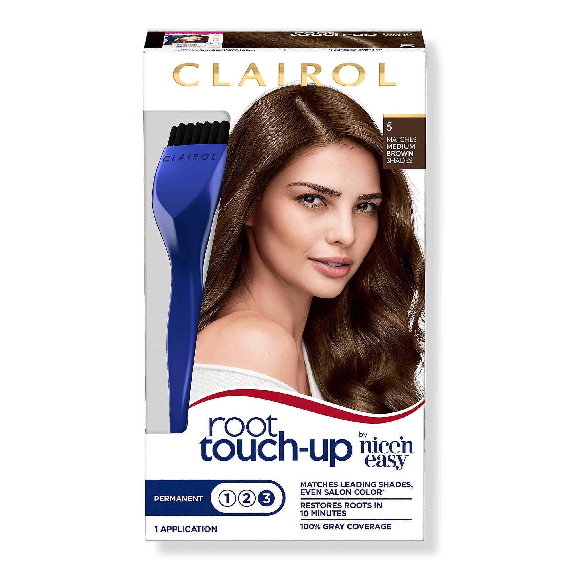 Extend the life of your hair color with Root Touch-Up by Clairol. This Medium Brown 5 shade provides seamless blending and complete coverage for graying roots. Benefits: Permanent color that blends seamlessly Provides complete gray coverage Precision brush for quick and easy application Works in just 10 minutes Clairol Nice 'N Easy Root Touch-Up in Medium Brown 5 is designed to help you maintain your hair color between full colorings. The precision brush allows for targeted application to visible roots at the hairline, part, and temples. This formula works quickly to provide natural-looking color. Ingredients Please refer to the product packaging for a complete list of ingredients. Suggested Use Prepare: Perform a skin test before use. Gather an old towel to protect surfaces and clothing, and have a clock ready for timing. Mix: Wear gloves. In the provided mixing tray, combine the Color Activating Lotion (bottle "2") with the Permanent Color Creme (tube "1"). Mix thoroughly using the Precision Color Brush. Apply: On dry hair, use the Precision Color Brush to apply color to visible roots at the hairline, part, and temples. Ensure roots are saturated with color. Wait: Set a timer for 10 minutes. Rinse: After the waiting period, rinse hair with warm water until the water runs clear. Style as usual without shampooing. Precautions: May cause mild irritation to eyes or skin. If irritation occurs, rinse immediately. If irritation persists, discontinue use and consult a healthcare professional. Avoid contact with eyes. Keep out of reach of children.