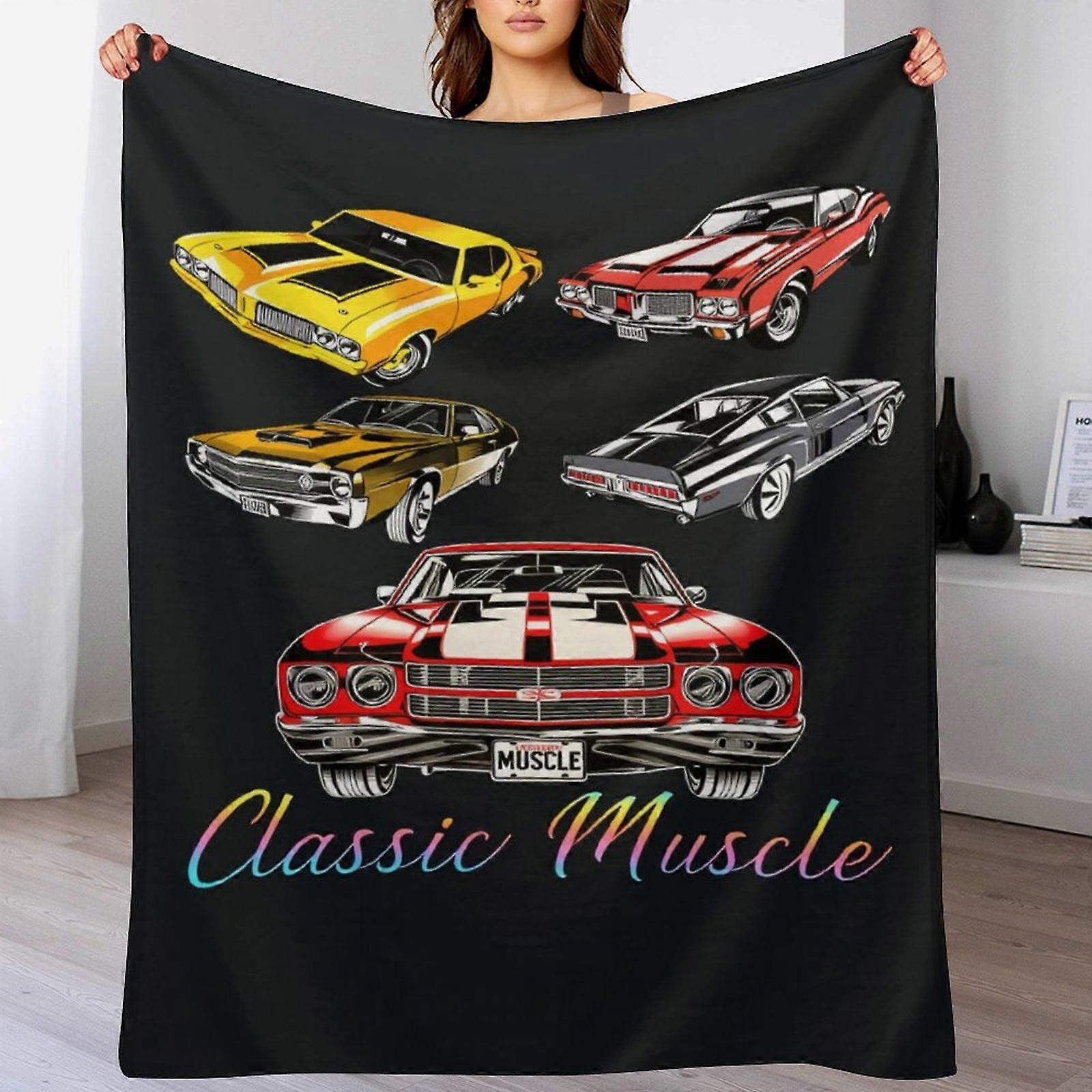 Classic Muscle Car Graphic & "Classic Muscle" Text Print Flannel Blanket - Soft Cozy Throw, 50x60 Inch, Car Enthusiast Gift (Living Room/Bed)