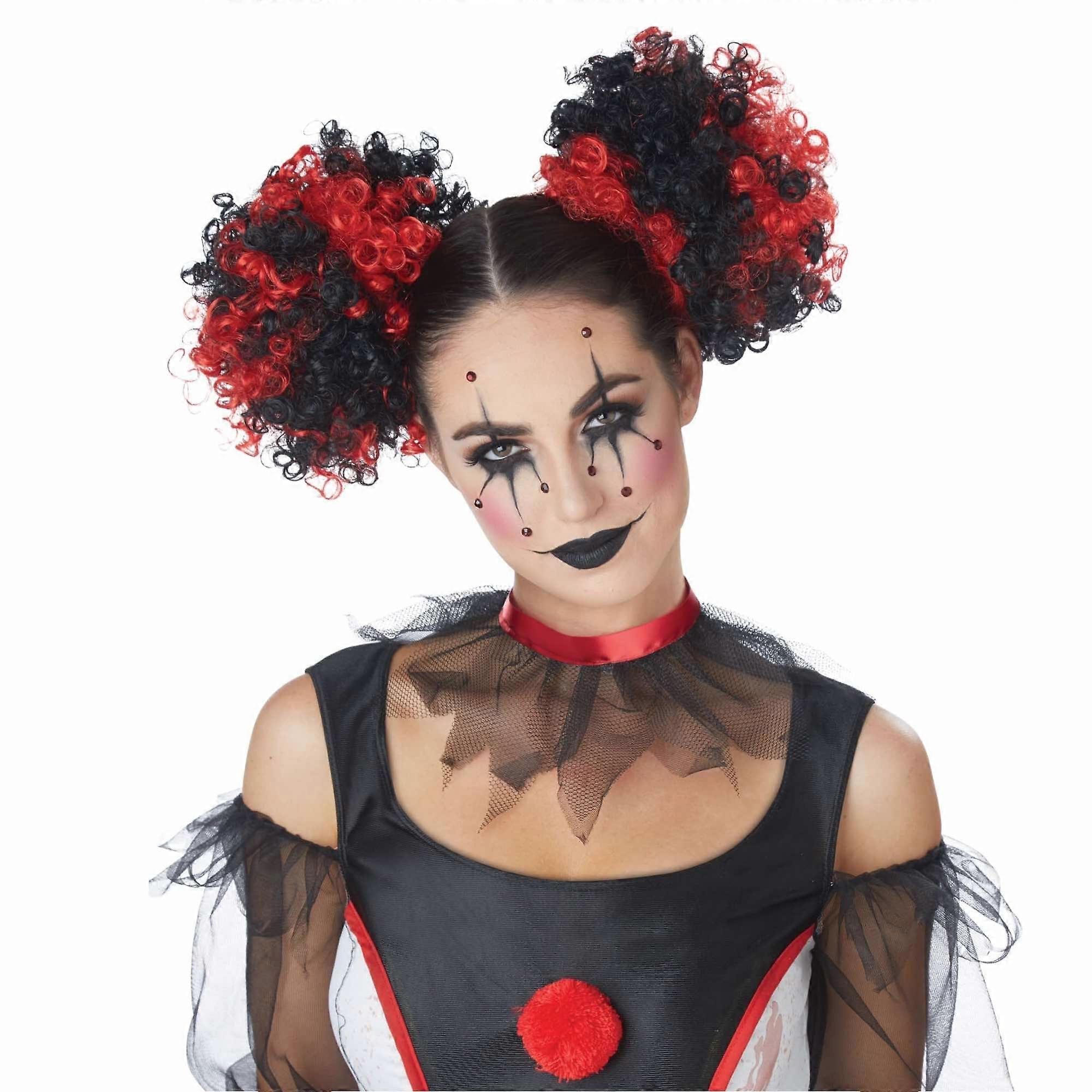 Clown Evil Jester Joker Black Mardi Gras Womens Costume Tight Curly Puffs Wig