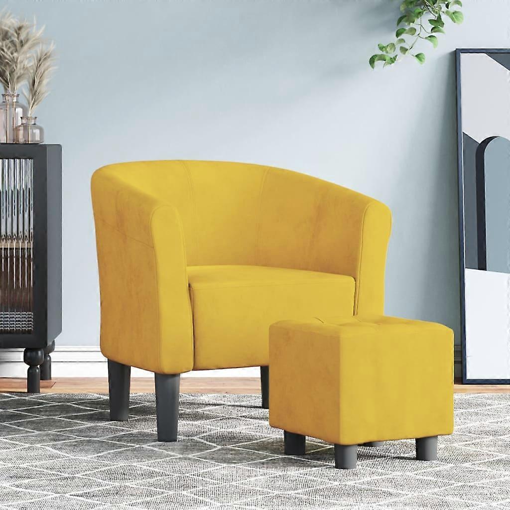 Dieser moderne Clubsessel mit Fußhocker verleiht deinem Wohnzimmer, Schlafzimmer, Gästezimmer oder Büro einen Hauch Eleganz Weicher Samt: Der Akzentsessel ist mit Samt bezogen, einem weichen und bequemen Stoff, der sich angenehm auf der Haut anfühlt. Robustes und stabiles Gestell: Das Gestell dieses Sessels ist aus Sperrholz und Kiefernholz gefertigt, um Robustheit und Stabilität zu gewährleisten.Praktischer Fußhocker: Der Hocker eignet sich zum Ausruhen der Füße, kann aber auch als zusätzliche Sitzgelegenheit in deinem Zimmer dienen. Darüber hinaus eignet er sich durch sein schlichtes Design und seine kompakte Größe für fast alle Wohnräume.Bequemes Sitzerlebnis: Dank der dick gepolsterten Sitzfläche, Rückenlehne und Armlehnen ist dieser Sessel sehr bequem. Er ist die ideale Wahl, um dich beim Lesen, Plaudern, Fernsehen oder Musikhören zu entspannen. Farbe: GelbMaterial: Samt (100 % Polyester), Kiefernholz, Sperrholz, KunststoffFüllung: SchaumstoffZusammenbau erforderlich: JaClubsessel:Abmessungen: 70 x 56 x 68 cm (B x T x H) Sitzgröße: 46,5 x 45 cm (B x T)Sitzhöhe vom Boden: 39 cmArmlehnenhöhe vom Boden: 57,5 cm Maximale Belastbarkeit: 110 kg Fußhocker:Abmessungen: 31 x 31 x 32 cm (B x T x H)KnopfheftungLieferung umfasst:1 x Clubsessel1 x Fußhocker