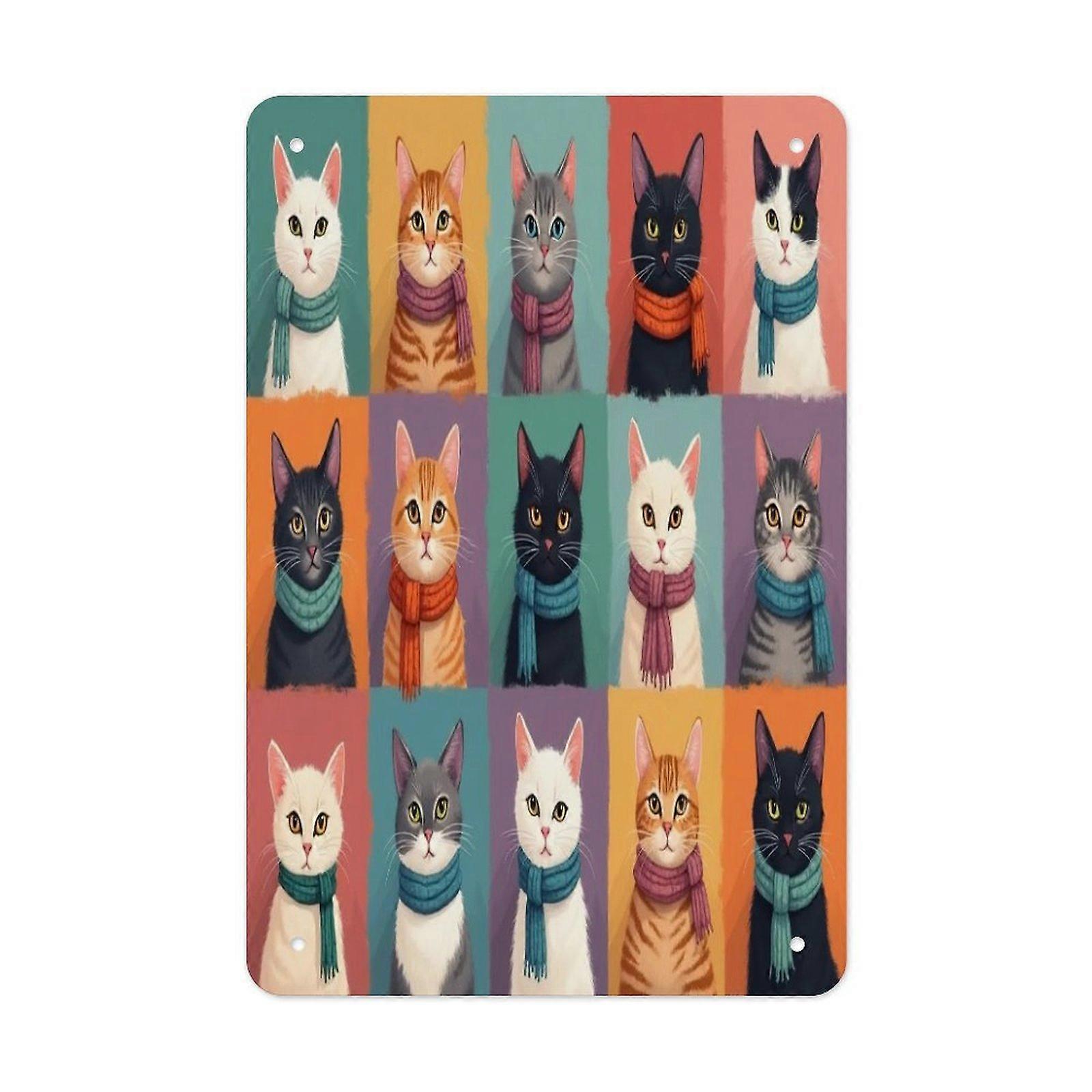 Colorful Cat Illustration Metal Tin Sign, Cute Animal Patchwork Wall Art Decor for Home Bedroom Living Room, Fun Cartoon Style