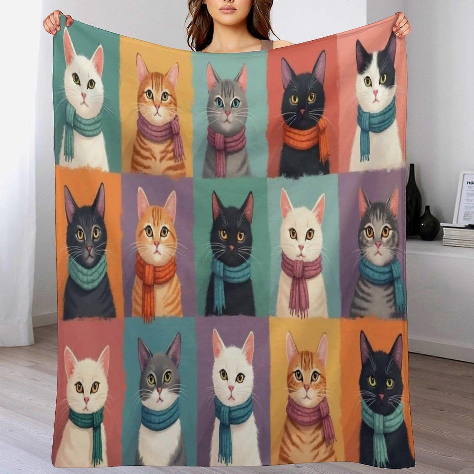 Colorful Scarf Cat Portrait Patchwork Print Fleece Blanket, Cute Cartoon Kitten Throw, Soft Warm Cozy Blanket for Sofa Bed Bedroom Living Room, Cat Lo