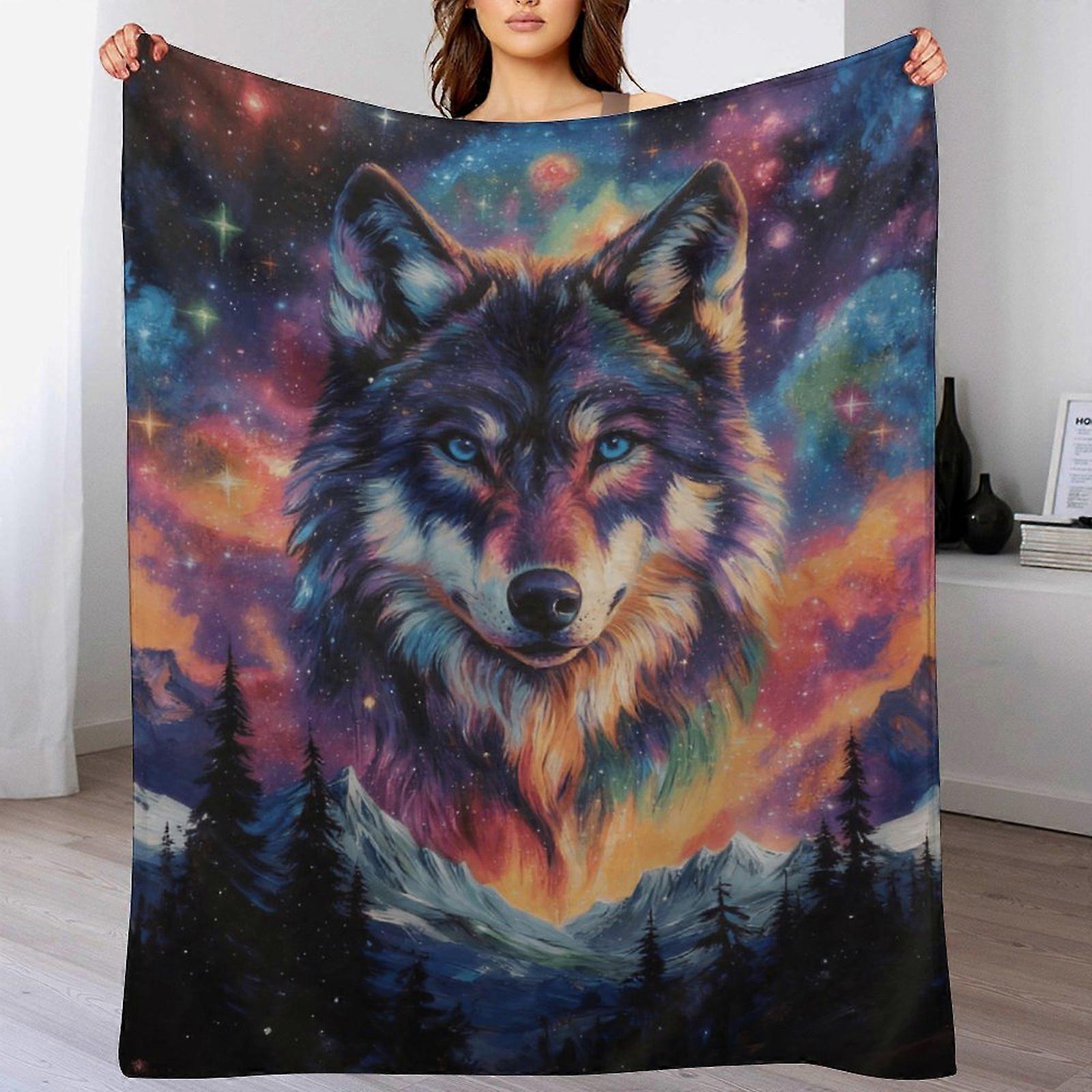 Colorful Wolf Starry Sky & Mountain Print Flannel Blanket - Soft Warm Throw for Living Room | Nature Decor for Animal Lovers