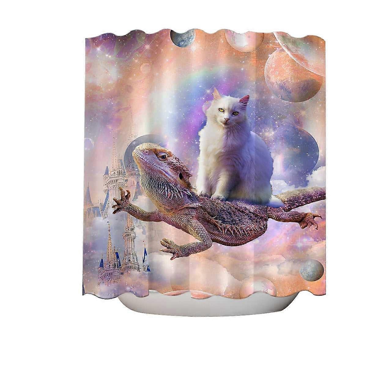 Cool White Cat Riding a Dragon Lizard in Space Shower Curtain