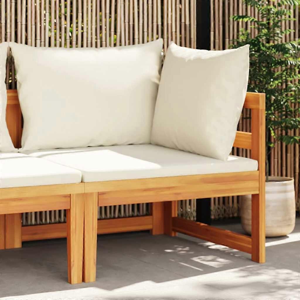 Genießen Sie eine gemütliche Zeit mit Ihren Freunden oder Ihrer Familie im Außenbereich auf diesem Ecksofa aus Holz Dieses Garten-Ecksofa ist aus massivem Akazienholz gefertigt, einem Hartholz mit dichter Maserung. Daher ist das formschöne Gartensofa stabil, langlebig und auffällig. Dabei machen die exquisite Handwerkskunst und die schöne Holzmaserung jedes Möbelstück zu einem Unikat. Darüber hinaus sorgen die mitgelieferten Kissen für mehr Komfort beim Ausruhen. Hinweis: Um die Lebensdauer Ihrer Gartenmöbel zu verlängern, empfehlen wir Ihnen, diese regelmäßig zu reinigen und bei Nichtgebrauch im Freien abzudecken.Reinigung: Verwenden Sie eine milde Seifenlösung.Lagerung: Wenn möglich, an einem kühlen, trockenen Ort im Innenbereich lagern. Wenn das Produkt im Freien gelagert wird, schützen Sie es mit einer wasserdichten Abdeckung. Wischen und trocknen Sie das überschüssige Wasser oder den Schnee nach Regen oder Schneefall von der ebenen Fläche. Sorgen Sie für eine ausreichende Luftzirkulation, um feuchtigkeitsbedingte Schäden zu vermeiden. Kissenfarbe: CremeweißMaterial: Massives Akazienholz mit Ölfinish, Stoff (100% Polyester)Abmessungen: 66 x 66 x 60 cm (L x B x H)Sitzhöhe vom Boden: 29 cmPolster-Stärke: 6 cmKissendicke: 12 cmZusammenbau erforderlich: JaLieferung enthält:1 x Sofa-Eckteil1 x Sitzpolster2 x Rückenkissen