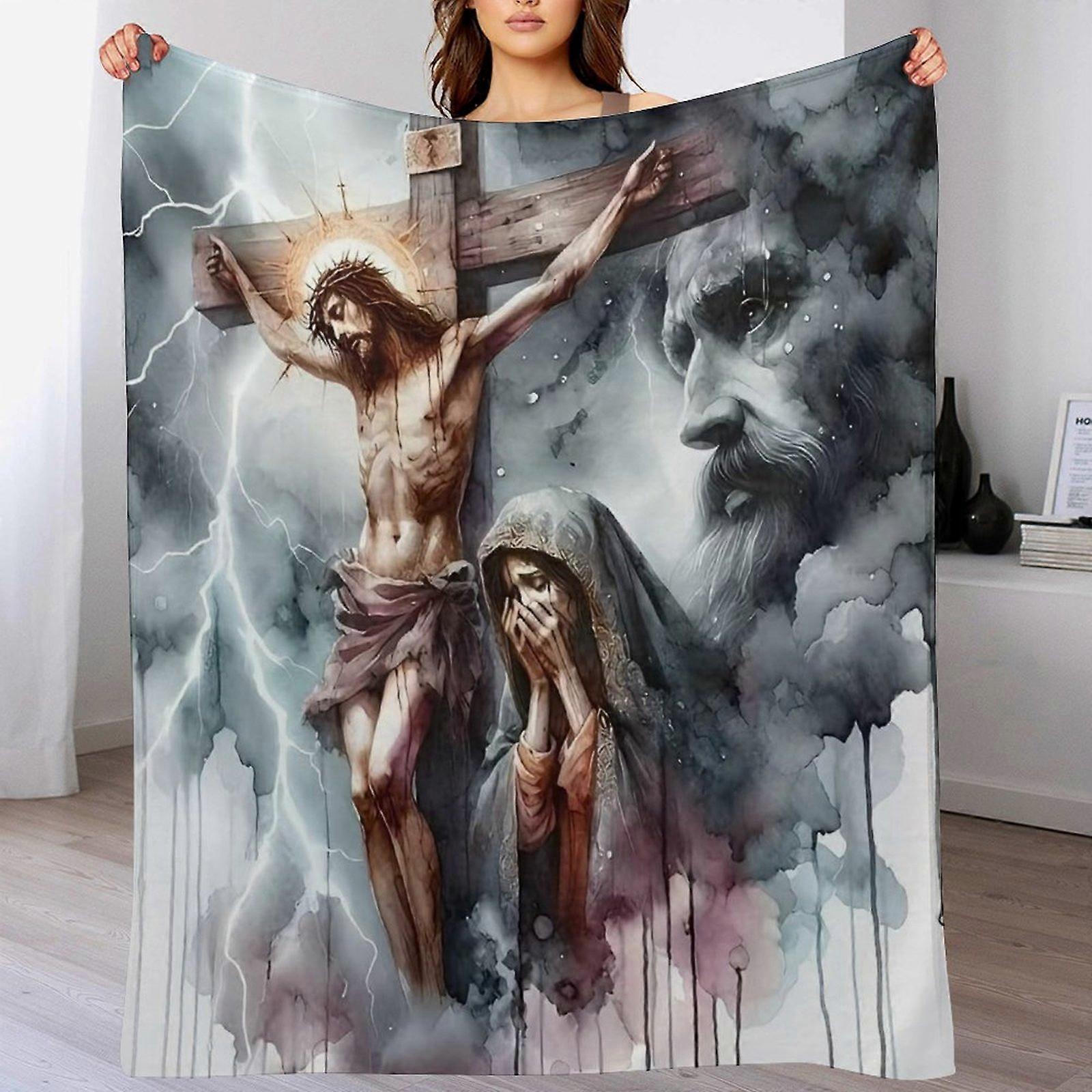 Cross Watercolor Print Flannel Blanket - Soft Warm Throw for Sofa | Spiritual Decor for Faithful Individuals