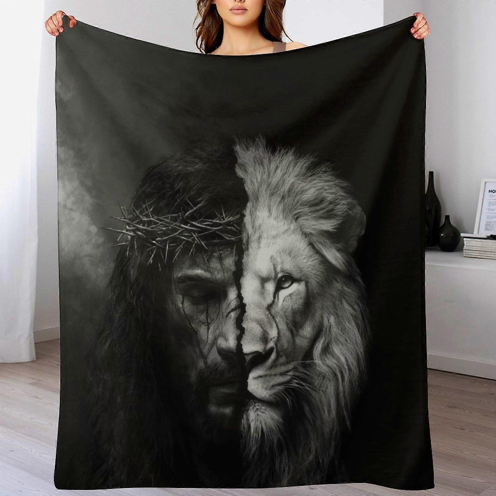 Crown of Thorns & Lion Split Portrait Print Flannel Blanket - Soft Warm Throw | Faith-Inspired Decor for Home