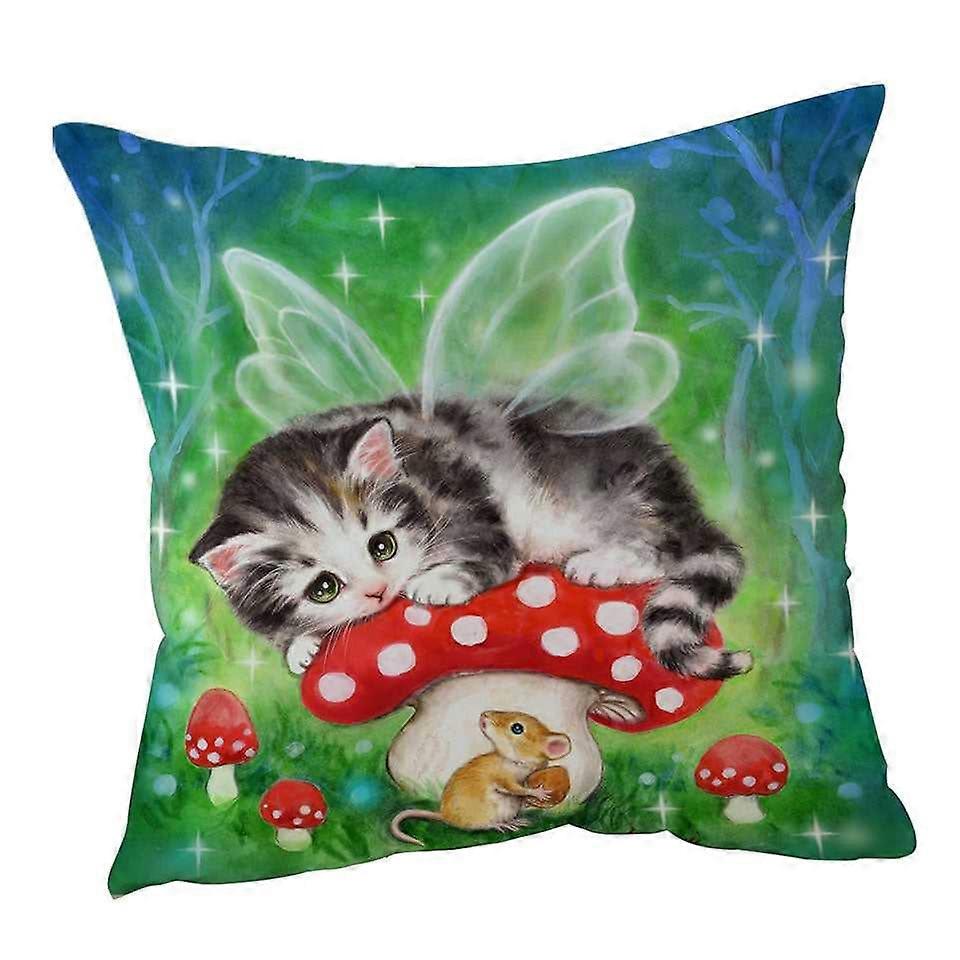 Cute Fantasy Cat Art Kitten Fairy on Mushroom Cushion Cover