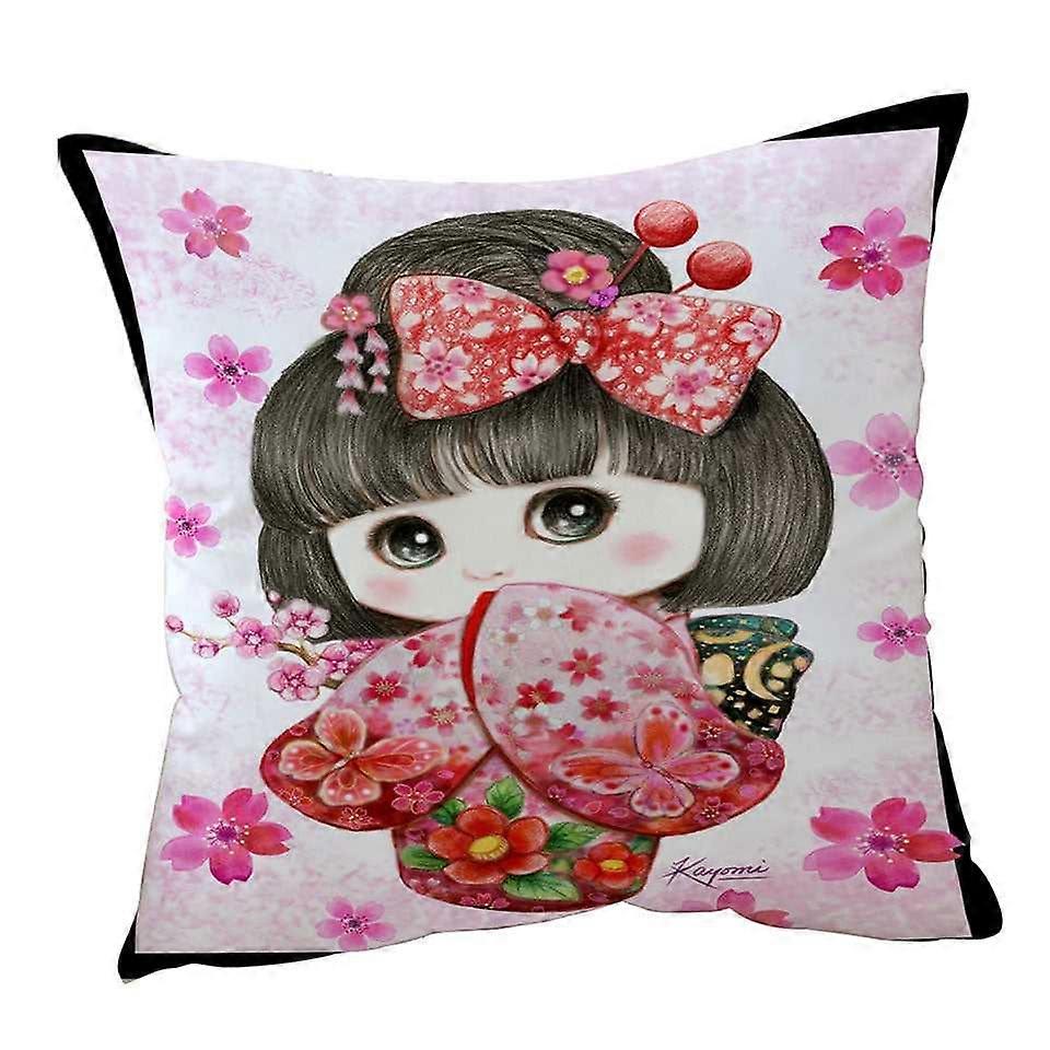 Cute Japanese Kimono Cherry Flowers Girl Cushion Cover