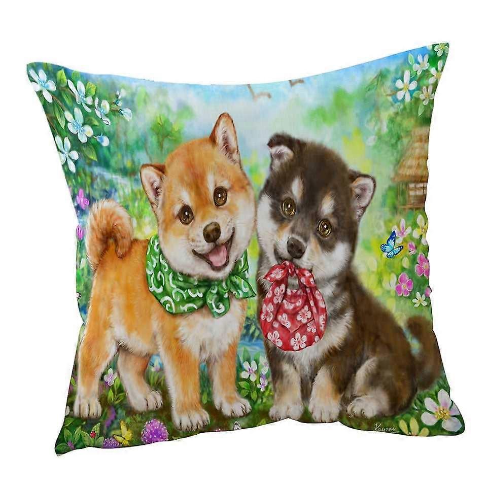 Cute Shiba Inu Dog Puppies in Flower Garden Cushion Cover