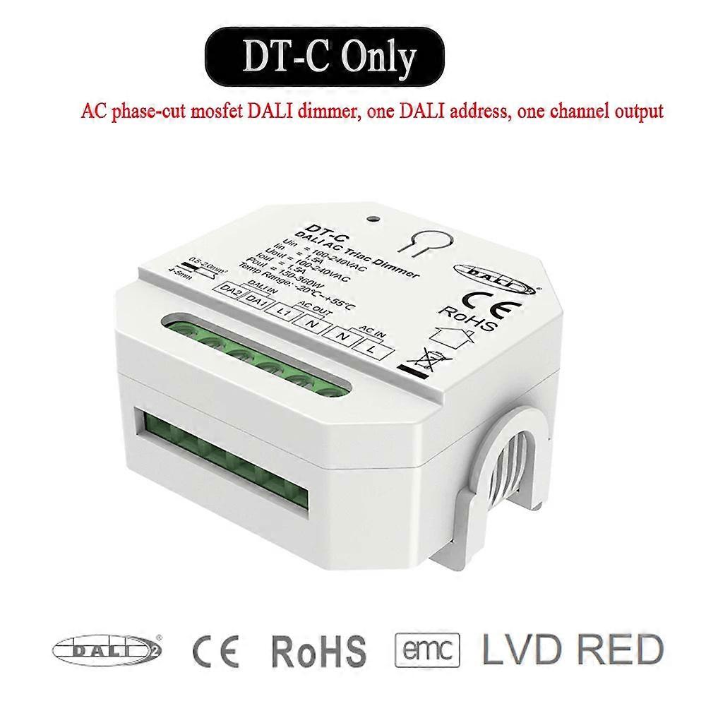 Dali Triac Dimmer Dt-c Push Switch For Single Color Led Lamps 100-240v 360w. Introducing the Versatile DALI AC Triac Dimmer DT-C, Designed for Seamless Integration with Single-color Dimmable LED Lamps, Traditional Incandescent, and Halogen Lights. This Dimmer Offers Precise Control with a 256-level Dimming Range from 0-100%. Its AC Phase-cut Technology Provides Efficient Power Regulation, Ensuring Optimal Performance. With the Option to Choose Between Leading Edge and Trailing Edge Dimming, You Can Tailor the Lighting Experience to Your Preference. The Dimmer Also Includes a Push Switch Dimming Function for Easy On/off and Adjustment Capabilities. Compliant with DALI-2 Standards, It Easily Integrates with Other DALI-certified Products and Allows Automatic DALI Address Assignment. Safety Features Include Overheat and Overload Protection with Automatic Recovery, Ensuring Durability and Reliability. Adjust the Minimum Brightness Conveniently, Setting It to Your Desired Level or Deleting It As Needed. Features Summary: - Input/Output Voltage: 100-240VAC - Max. Load Power: 360W - Dimming Levels: 256 - Dimming Range: 0-100% - DALI AC Triac Dimmer with Push Switch Function - Trailing Edge and Leading Edge Dimming Selectable - DALI-2 Certified - Overheat and Overload Protection - Material: ABS - Warranty: 5 Years Upgrade Your Lighting with the Cutting-edge DALI AC Triac Dimmer DT-C for Superior Performance and Flexibility..
