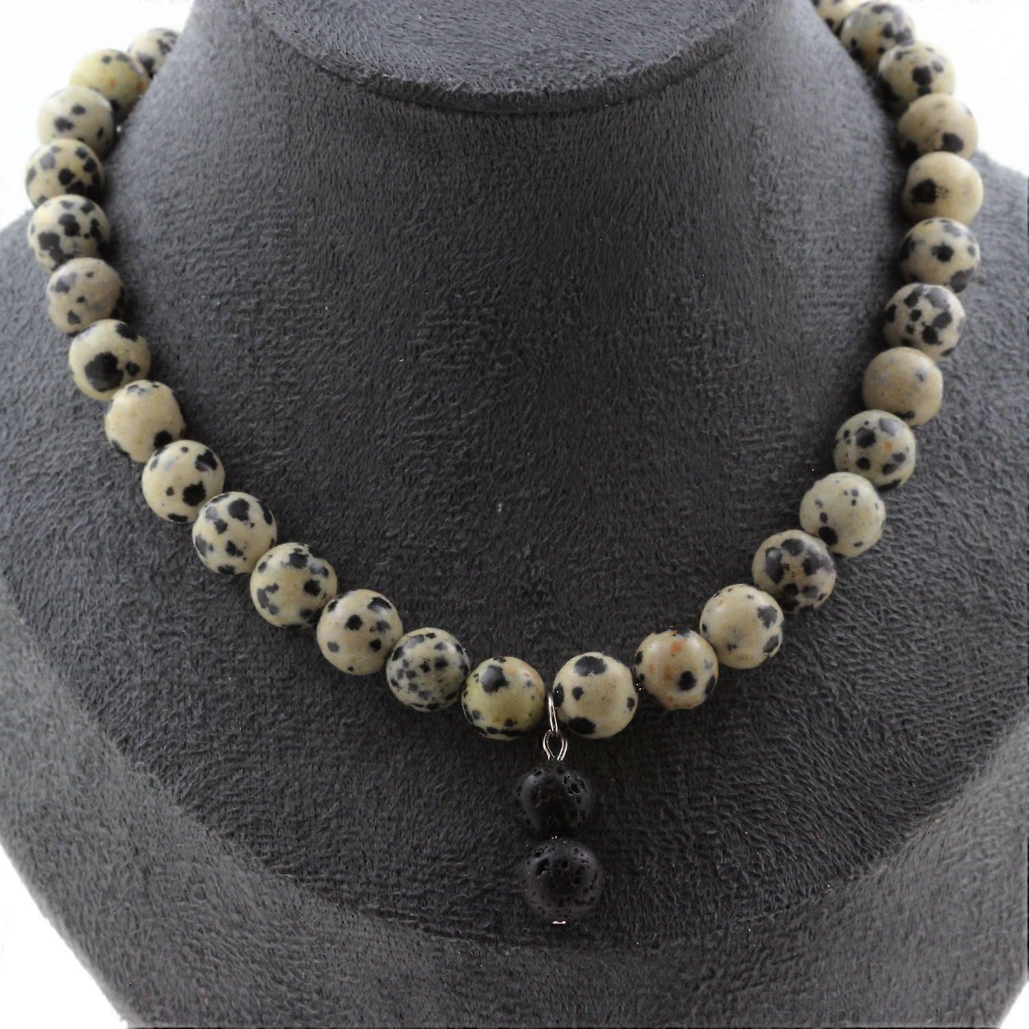 Dalmatian Jasper beaded necklace 8 mm + 2 Lava beads 8 mm Stainless steel chain