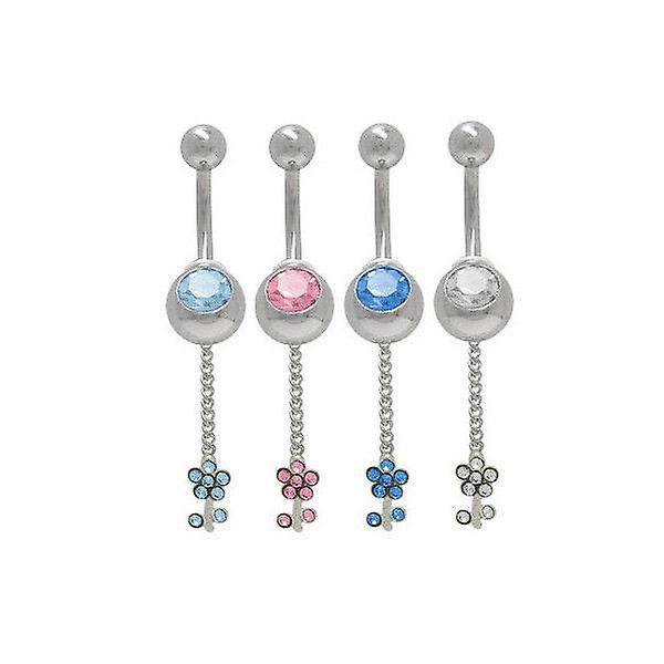 Dangling Flower Belly Ring with Cz Jewels This dangling flower navel ring leaves a stunning impression.Made with a 316L surgical steel shaft and sparkling cubic zirconia jewels.This belly ring is 14 gauge and the length is 10mm-3/8 of an inch.The top bead size is 5mm and the bottom is 8mm.The entire piece is nickel free.Item sold individually.