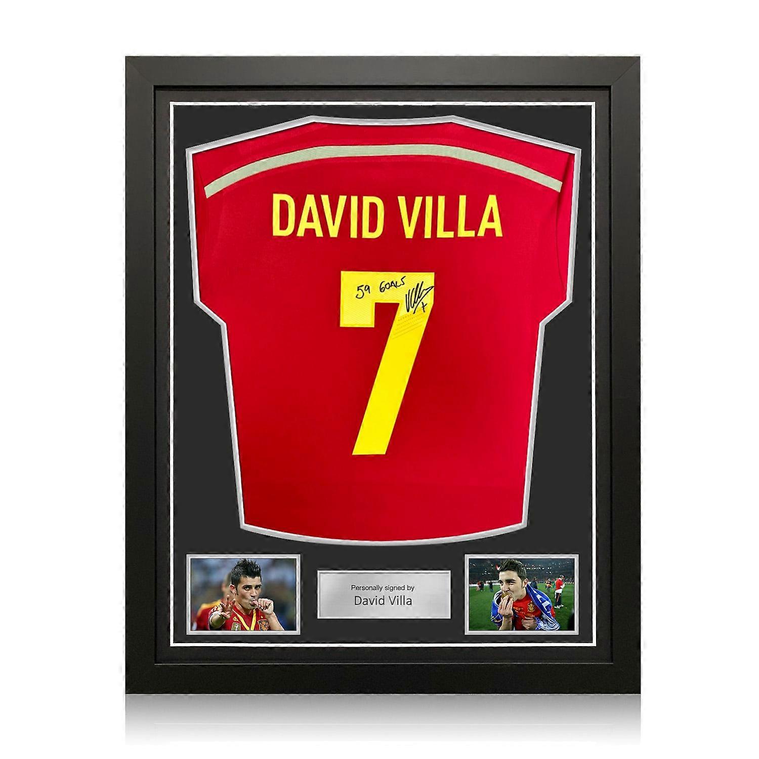 Original official 2013-15 Spain home shirt, fan style printing, 59 goals inscription, signed by David Villa. Please note, these original shirts may have some natural wear and tear. In standard black frame. Approximate size: 840 x 670 mm / 33 x 26.5 inches / This original Spain football shirt was signed by David Villa on September 16th 2025 in Madrid. This style shirt was worn by David Villa and the Spanish team during their 2014 World Cup campaign. Villa scored his last international goal for Spain during the 2014 tournament. David Villa is Spain's all-time record goal scorer, with 59 goals. All signatures are originals they are never printed. The product image is a stock photo so the position of signatures might vary slightly. Exclusive Memorabilia unconditionally guarantees all signed items are genuine. The item will come with a certificate of authenticity featuring a numbered hologram that matches an identical hologram affixed to the product. Exclusive Memorabilia is the UK's most trusted brand of sports and entertainment memorabilia, supplying Premiership football clubs, leading cruise lines and charities with their memorabilia for sale and auction.