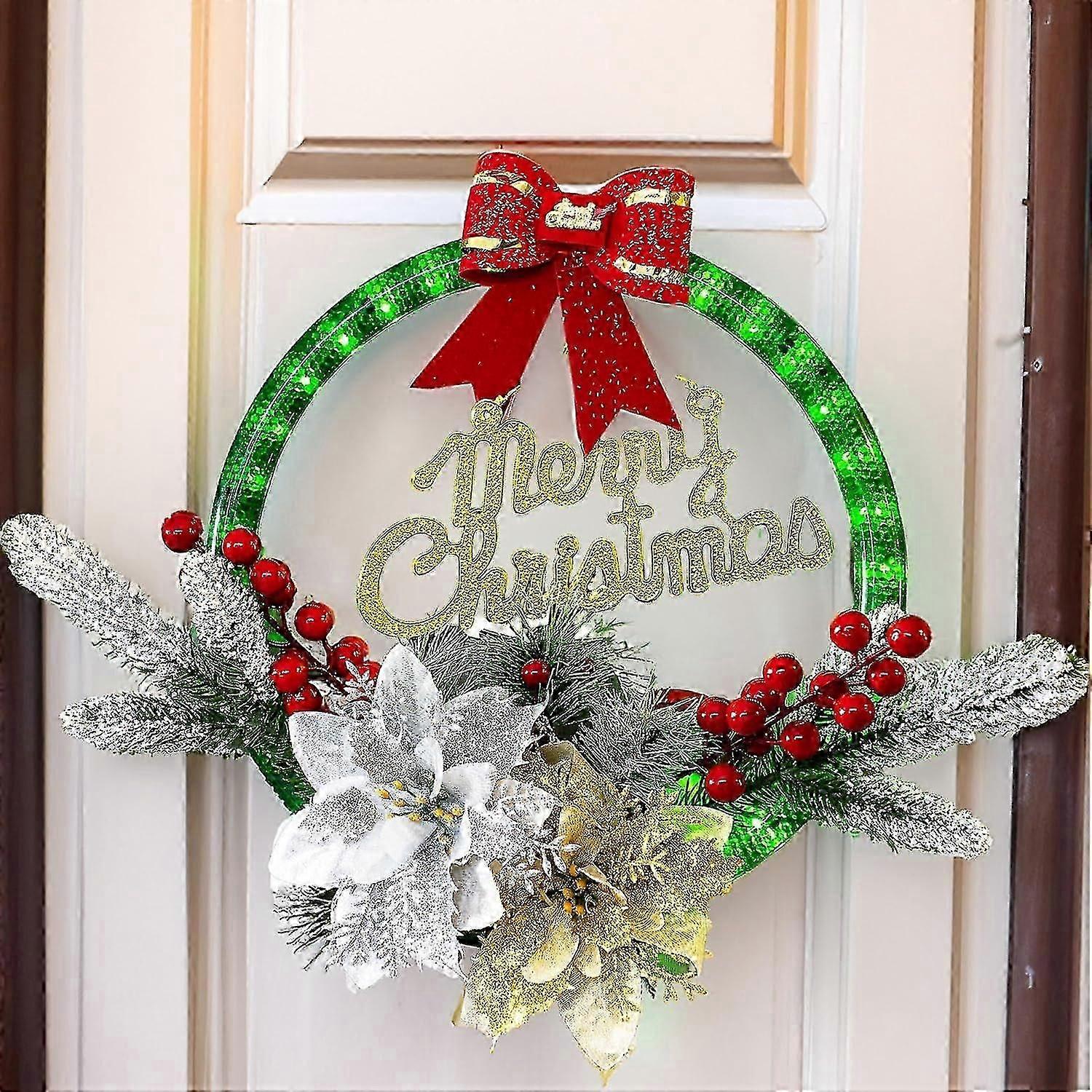 Unique Design: This 11-inch pre-lit Christmas wreath, embellished with red berries, red bows, and a "Merry Christmas" signage, captures the vibrant spirit of the holiday season, adding liveliness to your decorations. It also comes with a hanging rope for effortless door mounting, eliminating the hassle of wreaths falling from your door!Battery Operated: This pre-lit Christmas wreath is powered by 3 AA batteries (not included), with a button on the battery box for easy light control. This stunning Christmas wreath would be an outstanding adornment for your front door, making it a must-have for the forthcoming Christmas holiday season.Easy to Use: This requires no assembly and is ideal to be hung on your wall or door. Its portability and easy installation add to its convenience. With its ultra-realistic and lifelike appearance, it enhances your home with a splash of color and a natural ambiance.High Quality Material: Crafted from durable plastic material, the Winter Christmas wreaths are resistant to deformation. They perfectly blend aesthetically-pleasing pine needles with striking red berries. Boasting a realistic, non-fading, and waterproof design, these wreaths promise repeat use.Ideal Christmas Decorations: This Christmas wreath offers a simple yet elegant solution for adorning your front door, indoor and outdoor spaces for various festivities. It's ideal for spicing up Christmas holiday decorations, various festival celebrations, and adding charm to living rooms, frames, stairways, mantels, gardens, stores, offices, and so forth.Unique Design: This 11-inch pre-lit Christmas wreath, embellished with red berries, red bows, and a "Merry Christmas" signage, captures the vibrant spirit of the holiday season, adding liveliness to your decorations. It also comes with a hanging rope for effortless door mounting, eliminating the hassle of wreaths falling from your door!Battery Operated: This pre-lit Christmas wreath is powered by 3 AA batteries (not included), with a button on the battery box for easy light control. This stunning Christmas wreath would be an outstanding adornment for your front door, making it a must-have for the forthcoming Christmas holiday season.Easy to Use: This requires no assembly and is ideal to be hung on your wall or door. Its portability and easy installation add to its convenience. With its ultra-realistic and lifelike appearance, it enhances your home with a splash of color and a natural ambiance.High Quality Material: Crafted from durable plastic material, the Winter Christmas wreaths are resistant to deformation. They perfectly blend aesthetically-pleasing pine needles with striking red berries. Boasting a realistic, non-fading, and waterproof design, these wreaths promise repeat use.Ideal Christmas Decorations: This Christmas wreath offers a simple yet elegant solution for adorning your front door, indoor and outdoor spaces for various festivities. It's ideal for spicing up Christmas holiday decorations, various festival celebrations, and adding charm to living rooms, frames, stairways, mantels, gardens, stores, offices, and so forth.
