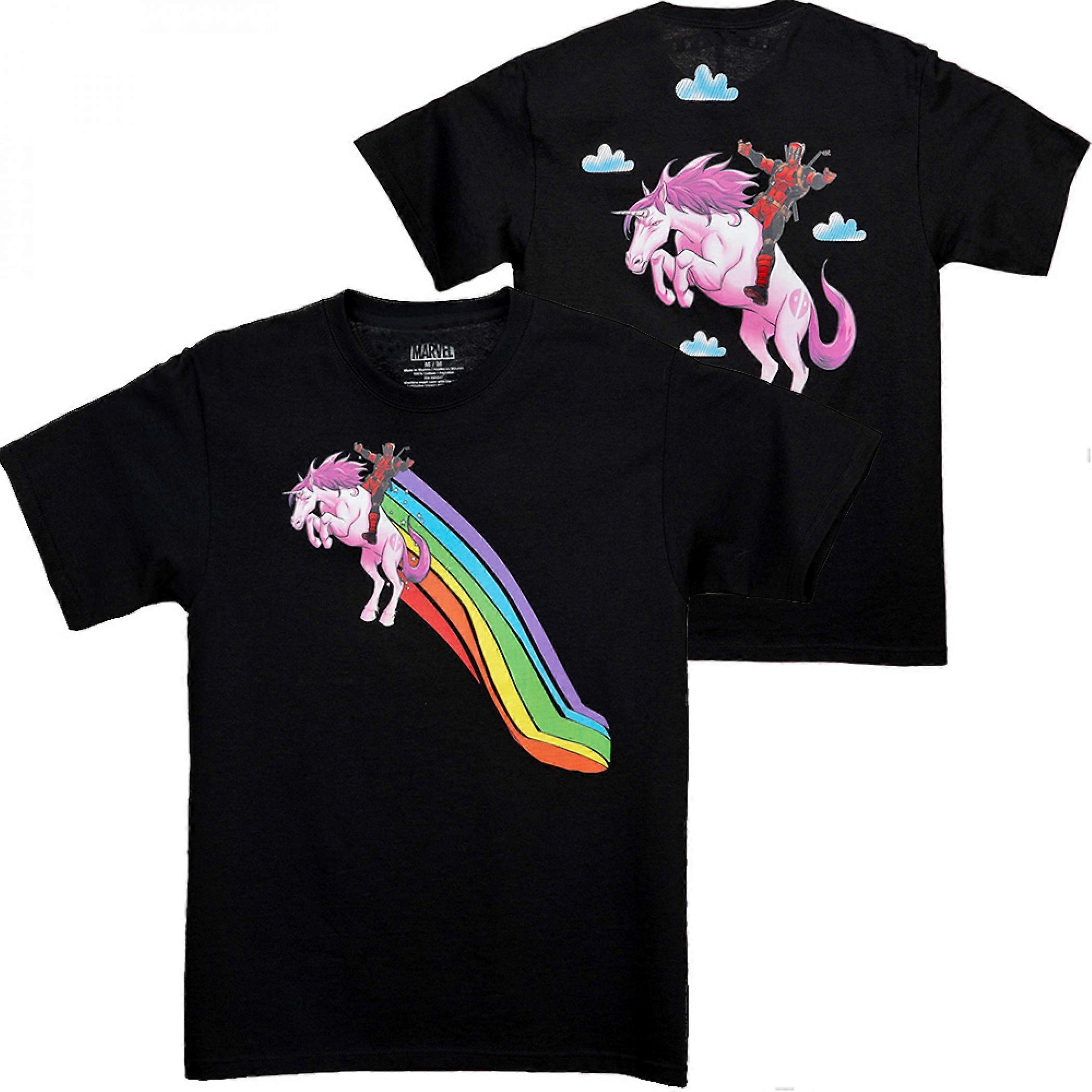 Deadpool Flying High on a Unicorn Front and Back T-Shirt