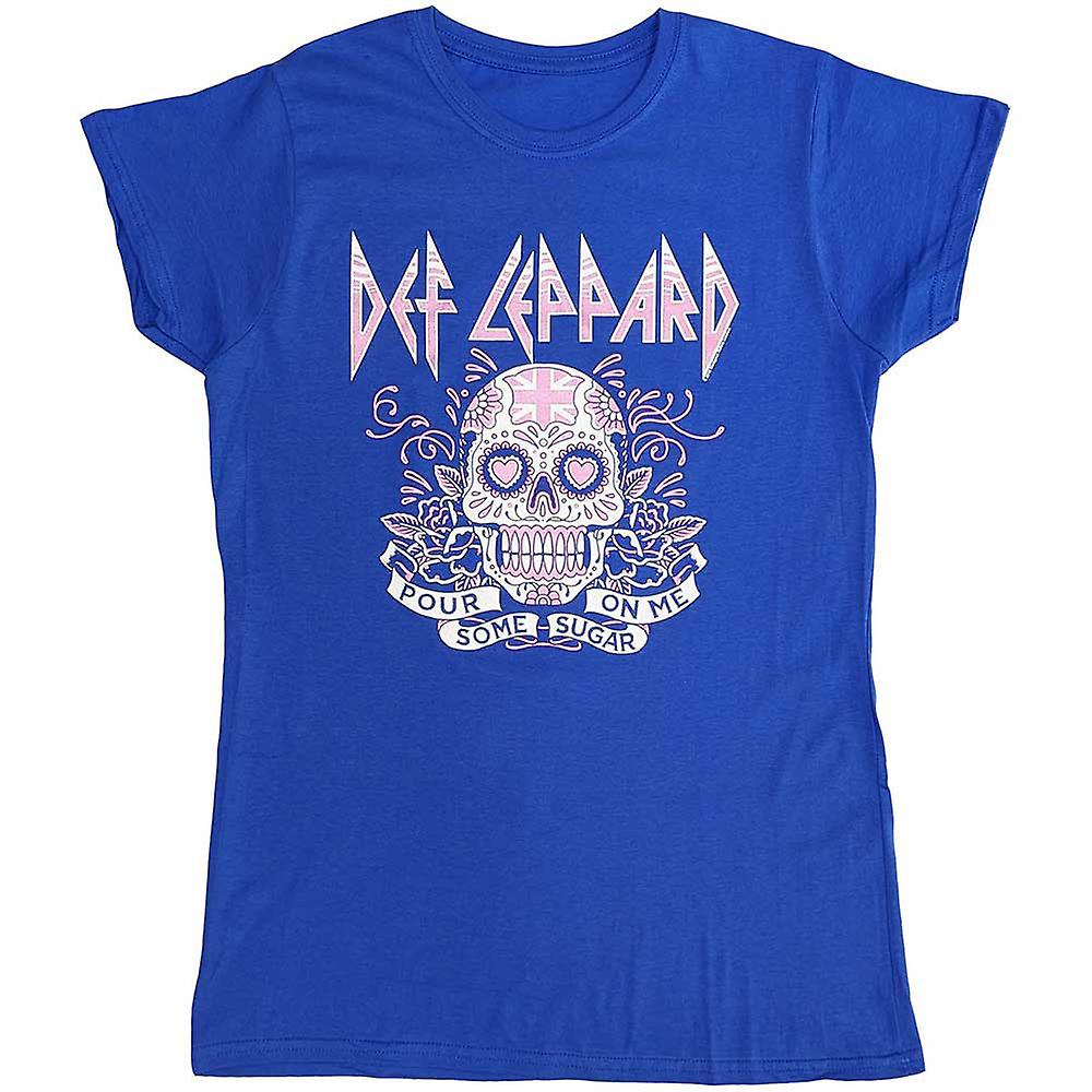 An official licensed Def Leppard Ladies T-Shirt featuring the 'Pour Some Sugar On Me Skull Tour 2019' design motif. This high quality T-Shirt is available in a blue colourway. High quality soft-style cotton ladies t-shirt featuring front printing. Comes in a wide range of sizes from Small through XX-Large, subject to availability.