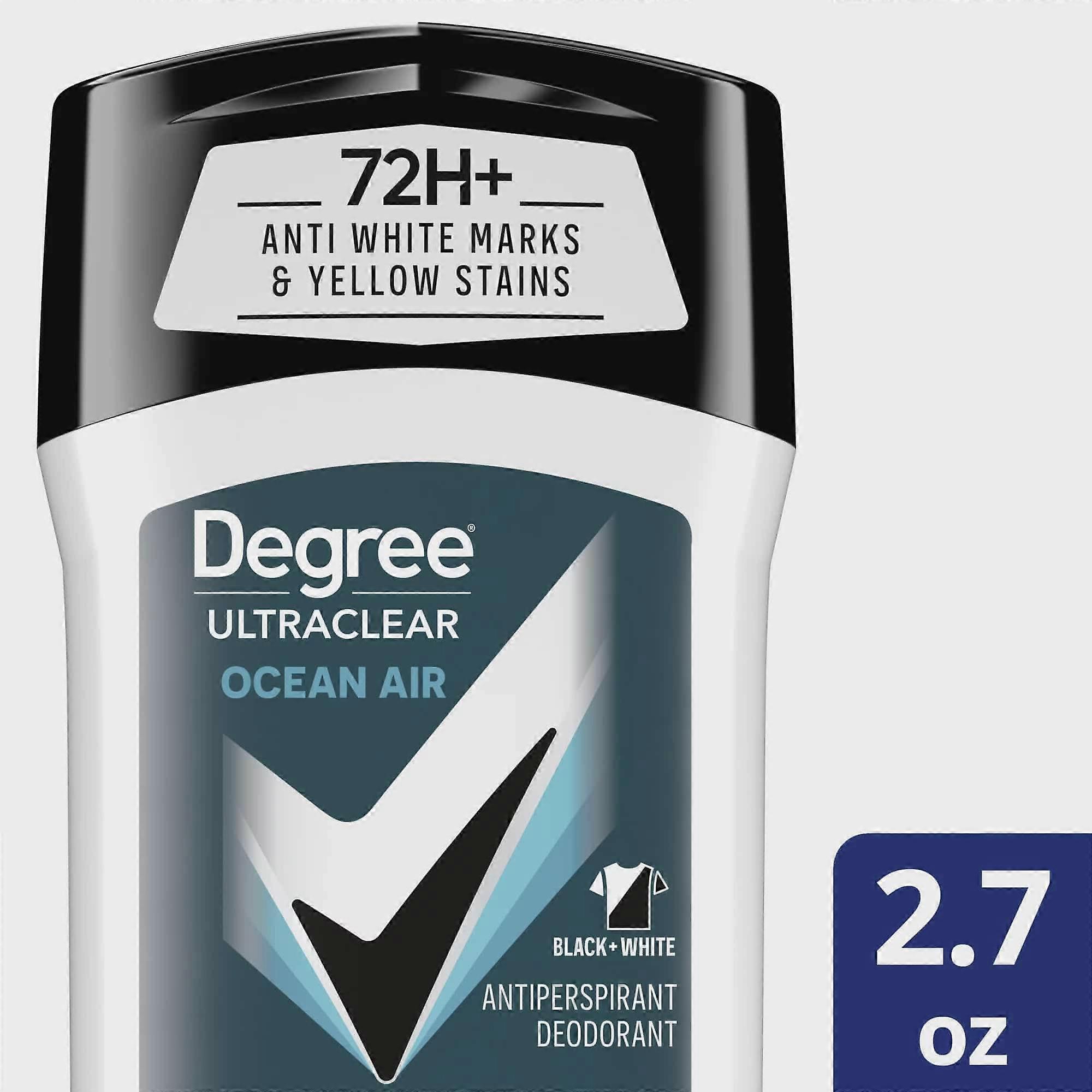 Degree Men UltraClear Black White Ocean Air Antiperspirant Deodorant with long-lasting MotionSense technology is specially designed to keep your clothes looking new. No white marks on black clothes and no yellow stains on white clothes. You'll look great all day and free from deodorant stains. This antiperspirant for men has a formula that cuts down on the stains that some antiperspirants leave behind when they mix with sweat and natural oils produced by your body. It also provides 72-hour sweat and odor protection to keep you moving and free to live life to its fullest. This antiperspirant deodorant stick also contains Degree's innovative MotionSense technology. It works like this: unique microcapsules sit on the surface of your skin. When you move, friction breaks those microcapsules, and they release more fragrance. So, every time you move, Degree keeps you fresh and free from odor. This antiperspirant deodorant stick works as hard as you do, keeping you protected, so you can keep moving and stay active. Simply glide and get moving. At Degree, we’re doing everything we can to help keep the planet moving. That’s why we're increasing our use of reusable materials, making it easier for you to recycle our antiperspirant and dry spray packaging. Degree. It won’t let you down.Degree Men UltraClear Antiperspirant Deodorant 72-Hour Sweat Odor Protection Ocean Air Antiperspirant For Men With MotionSense Technology 2.7 oz WHITE SHIRT, BLACK SHIRT, NO PROBLEM: Degree UltraClear BlackWhite Ocean Air Antiperspirant Deodorant gives 72-hour sweat and odor protection with anti-white marks and yellow stains technology. YOU MOVE, IT WORKS: Our breakthrough MotionSense technology works in sync with your body, all day long. This deodorant for men releases a subtle burst of fragrance every time you move. DRESS WITH CONFIDENCE: This antiperspirant for men is made with anti-mark and anti-stain technology that protects your clothes from deodorant stains. REFRESHING SCENT: Degree Men UltraClear BlackWhite Ocean Air Antiperspirant Deodorant keeps you feeling all-day fresh with a clean, airy scent. RECYCLE WITH DEGREE: As well as increasing our use of reusable materials, we’re making it easier for you to recycle our antiperspirant and dry spray packaging. GO BEYOND YOUR LIMITS: At Degree, we want to inspire the confidence in everyone to move more and go further. We’re here to support your journey through an antiperspirant that moves with you.
