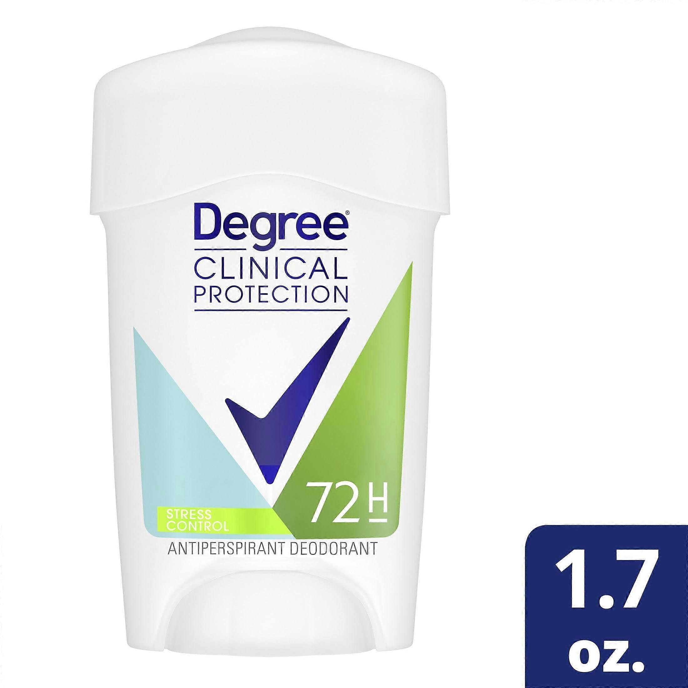 Degree Women Clinical Antiperspirant Deodorant Stress Control 1. 7 oz gives strong, yet gentle protection from sweat and body odor all day long. This antiperspirant deodorant provides advanced strength wetness protection so you can stay confident to perform at your best in even the most challenging situations. For best results, apply it to your underarms before going to bed. While you' rest the unique formula builds a strong level of protection from sweat and odor that lasts throughout the following day. Try pairing clinical protection with a Degree Women Motion Sense Antiperspirant Deodorant stick. This deodorant contains Degree s innovative Motion Sense technology to keep you fresh with every move. Degree Motion Sense responds directly to your body movement, releasing extra freshness when you move. Degree Motion Sense works like these unique microcapsules sit on the surface of your skin. When you move, friction breaks those microcapsules and they release more fragrance. So every time you move, Motion Sense keeps you fresh and free from body odor. The more you move, the more it protects. An active life can lead to sweat and body odor. Keep moving and keep fresh all day with Degree Women. Degree Women antiperspirant deodorant gives you long lasting 48-hour protection with fresh fragrance to protect against sweat and body odor. When life demands more from you, whether you're in the gym, in the office, or out and about with friends, stay confident and dry with Degree Women. Degree. It won't let you down. Suggested Use: Apply to underarms only. Before bed, apply two clicks of product to each underarm. For first use, turn the wheel in the direction indicated by the arrow until product is dispensed. For each subsequent use, turn the wheel two clicks to deliver recommended dosage. Apply the product directly to your underarms. For optimal application, ensure that underarms are dry. Replace cap after use. Store in dry conditions. For optimal performance: Degree Clinical Protection can be applied in the morning and also before going to bed; Nighttime application produces optimal results as Degree Clinical Protection is best activated by your body's resting temperature; This protection lasts throughout the following day, even after a shower. UPC: 079400327222 Weight: 0.5 lbs