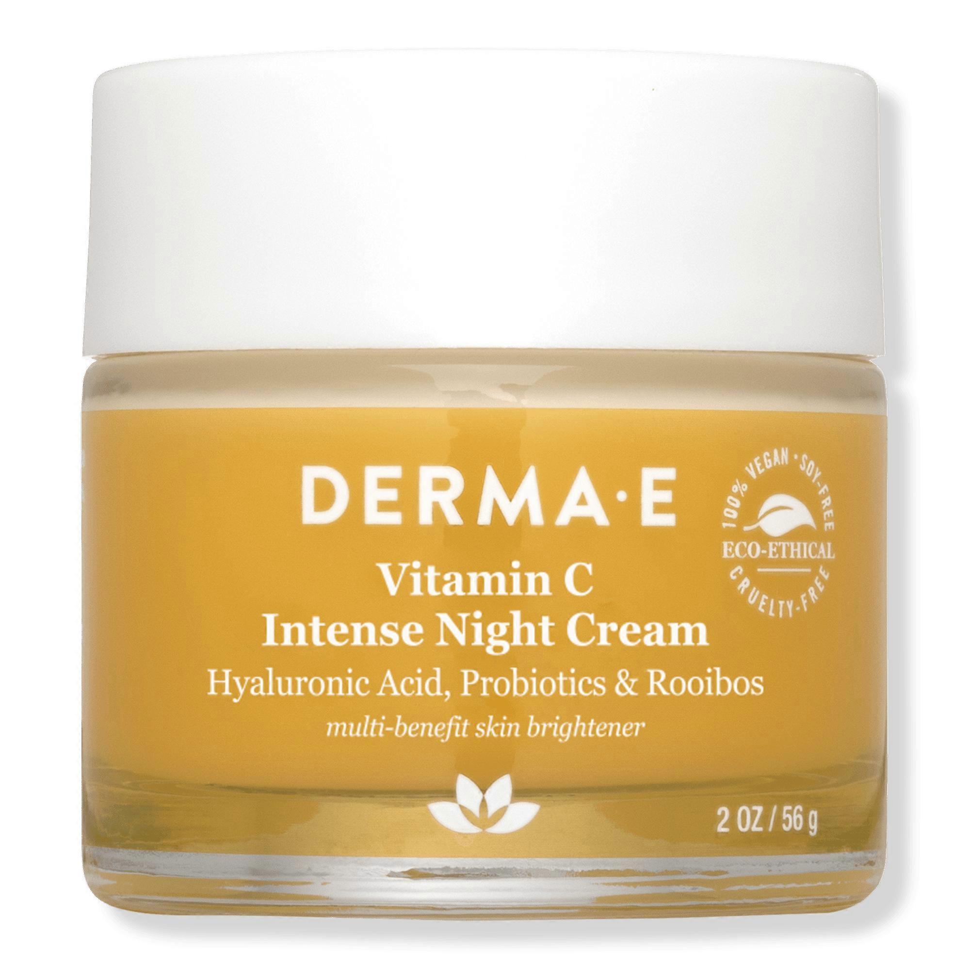 Derma E's Vitamin C Intense Antioxidant Night Cream is a luxurious, antioxidant-rich moisturizer that gives restoring overnight protection and supports natural rejuvenation of environmentally stressed skin. Benefits Vitamin C Night Cream both protects and nourishes your skin while you sleepUses a stabilized Vitamin C formula that is less likely to degrade before being absorbed by your skingives restorative moisture and antioxidants to renew the tone, texture and appearance of your skin Features 100% Vegan and Cruelty-freeRecyclable & wind energy certifiedFormulated without GMOs, gluten, or soy Key Ingredients Vitamin C: This potent antioxidant has skin-brightening and anti-aging properties that may help support collagen healthProbiotics: These may help to guard against daily environmental stressorsRooibos: An antioxidant-rich, plant-derived ingredient that helps to reduce the appearance of wrinkles and promote healthy skinHyaluronic Acid: Known as nature's "moisture magnet", it gives intense moisture, infusing skin with healthy hydration Inactive Ingredients: Water, Cetearyl Alcohol, Centrimonium Chloride, Stearyl Alcohol, Behentrimonium Chloride, Stearalkonium Chloride, Glycerin, Panthenol, Phospholipids, Amodimethicone, Polyqaternium-7, Trideceth-12, Caffeine, Hydrolyzed Wheat Protein, Hydroxyethylcellulose, Aloe Barbadensis Leaf Extract, Panax Ginseng Root Extract, Saccharum Officinarum (Sugarcane) Extract, Citrus Aurantium Dulcis (Orange) Fruit Extract, Citrus Limon (Lemon) Fruit Extract, Pyrus Malus (Apple) Fruit Extract, Camellia Sinensis (Green Tea) Leaf Extract, Paullinia Cupana (Guarana) Extract, Punica Granatum (Pomegranate) Extract, Rosmarinus Officinalis (Rosemary) Leaf Extract, Arnica Montana Flower Extract, Butyrospermum Parkii (Shea) Butter, Simmondsia Chinensis (Jojoba) Seed Oil, Rosmarinus Officinalis (Rosemary) Leaf Oil, Lavandula Angustifolia (Lavender) Oil, Argania Spinosa Kernel Oil, Eucalyptus Globulus Leaf Oil, Cupressus Sempervirens Leaf/Nut/Stem Oil, Leuconostoc/Radish Root Ferment Filtrate, Phenoxyethanol, Ethylhexylglycerin, Citric Acid. Suggested Use: Apply a rich layer onto clean face and neck. For best results, layer over Derma E Vitamin C Concentrated Serum. UPC: 000002501941 Weight: 0.63 lbs