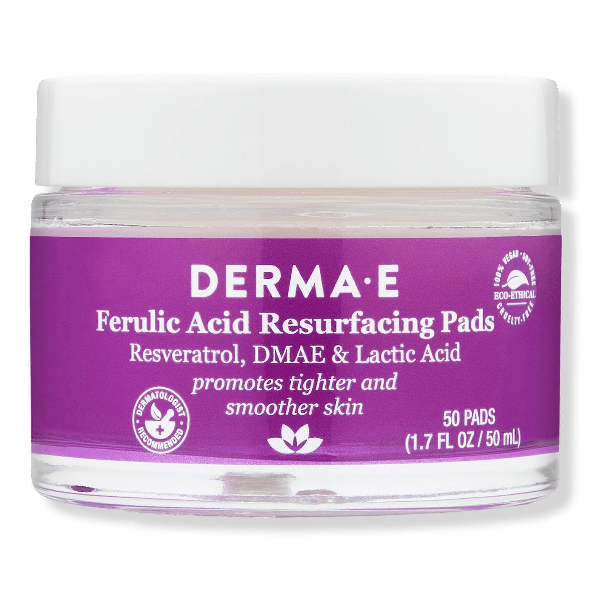 Derma E's Ferulic Acid Resurfacing pads with DMAE and Resveratrol work to deeply cleanse while removing dead skin cells, revealing new skin cells overtime. Benefits Visibly lifts, firms and tightensInfused with a unique blend of Resveratrol and Kojic Acid, Derma E's single-use, pre-soaked cotton pads remove dead skin cells to cleanse and resurface skin over timeResveratrol leaves skin firmer and stronger with its anti-aging effects of protecting from free radicals that cause collagen degradationKojic Acid has potent anti-aging properties as it helps to address hyperpigmentation and it aids in brightening age, dark or sun spots, and post-breakout marks Features 100% Vegan and Cruelty-freeRecyclable & wind energy certifiedFormulated without GMOs, gluten, or soy Key Ingredients Kojic Acid: Derived from mushrooms, provides potent anti-aging and skin brightening benefits, also helps to fade discoloration, age, dark or sun spotsResveratrol: protects the skin from daily environmental stresses to brighten dull-looking skin with its skin-calming propertiesDMAE: Helps to tighten, tone and firm the skin Suggested Use: Use one to three times a week, increase to daily use. Gently apply to the face, neck, décolletage Rinse thoroughly with water to neutralize peel and pat dry. UPC: 000002573852 Weight: 0.61 lbs