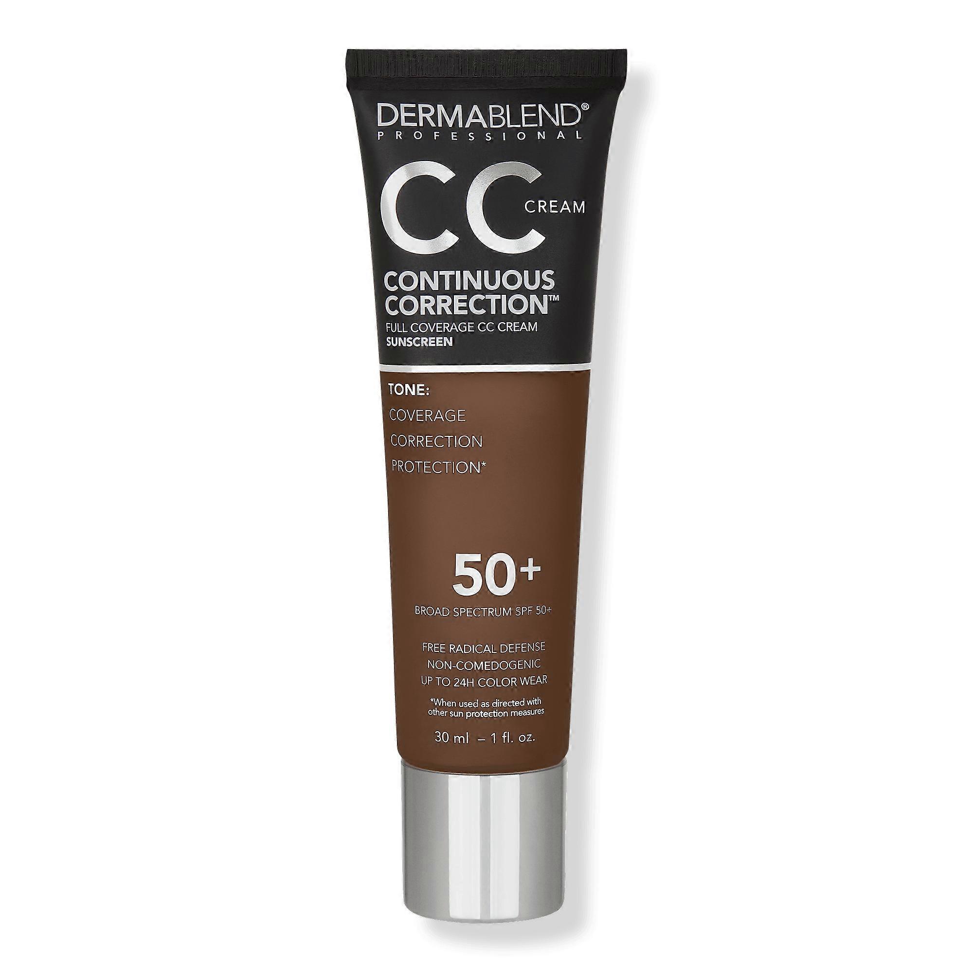 Cruelty-free. 1 Dermatologist Recommended Coverage Brand, Dermablend Continuous Correction Tone-Evening CC Cream SPF 50+. Non-comedogenic oil-free CC Cream foundation provides full coverage, broad spectrum SPF 50+, and free radical defense with a blend of antioxidants. Up to 24 hour color wear. Benefits Cruelty-freeDermatologist tested for safetyNon-comedogenicSensitive skin testedAllergy testedHigh performance pigments Features Weightless and breathable, this CC Cream gives a perfectly balanced and undetectable full coverage without clogging pores or weighing skin down. Fade-defying, up to 24 hour makeup color wear that stays comfortable and true.Clinically tested to visibly improve skin's radiance after 4 weeks*. Skin-first coverage helps visibly reduce the look of redness, discoloration, hyperpigmentation, dark spots and age spots, leaving your skin looking even, radiant, healthy and youthful.Continuous Correction Tone-Evening CC Cream is a full coverage foundation for all skin types, including oily, dry, acne-prone, and aging skin.Sun protection + free radical defense. Broad spectrum SPF 50+ sunscreen with no white cast defends the skin against sun damage to mitigate the signs of aging**.Provides protection against both UVA and UVB rays. The full coverage foundation is formulated with a blend of anti-oxidants: baicalin, niacinamide, vitamin E and caffeine.*Results based on expert grading in a four week clinical test**When used as directed with other sun protection measures Formulated Without FragranceParabensSLSTriclosanPhthalateOil Suggested Use: STEP 1 Apply: Apply Continuous Correction Tone-Evening CC Cream with fingertips, brush, or sponge from the center of face outwards. STEP 2 Blend: Blend into skin. UPC: 000002581038 Weight: 0.57 lbs